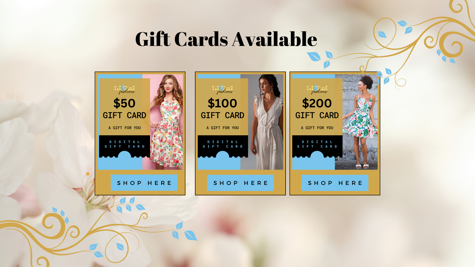 This image showcases digital gift cards available for purchase in $50, $100, and $150 denominations. Each card features a stylishly dressed model, a golden background, and bold black text indicating the value. The design emphasizes luxury and elegance, making it appealing for fashion-conscious shoppers. The "Shop Here" button on each card suggests an easy way for customers to purchase these gift cards online. Let me know if you need modifications or additional details!