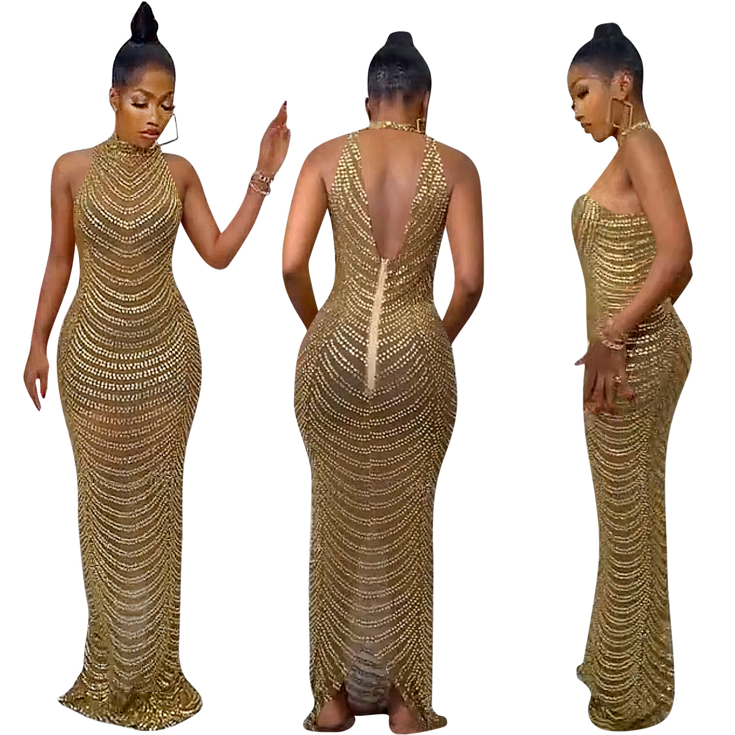 Fashion Sexy Backless Nightclub Party Formal Dress Rhinestone See-through Dress for Women