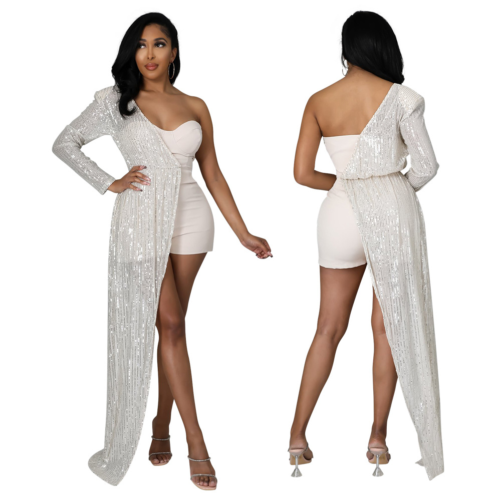 Fashion Sexy Tube Top Jumpsuit Stitching Sequined Long Sleeve Shawl for Women New
