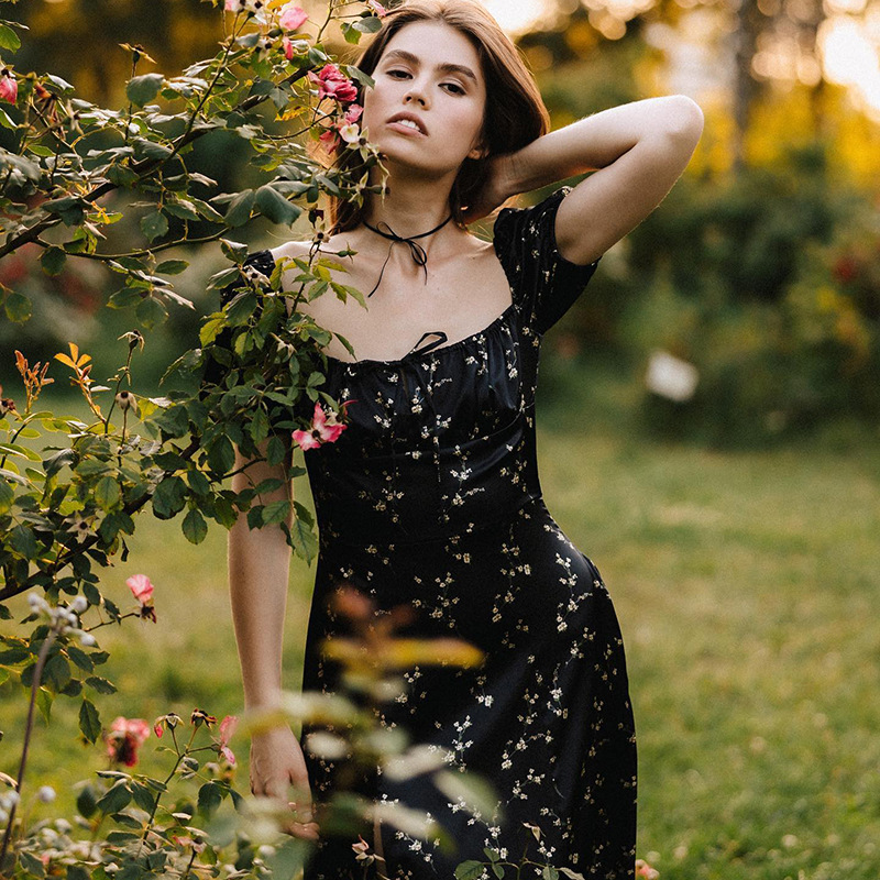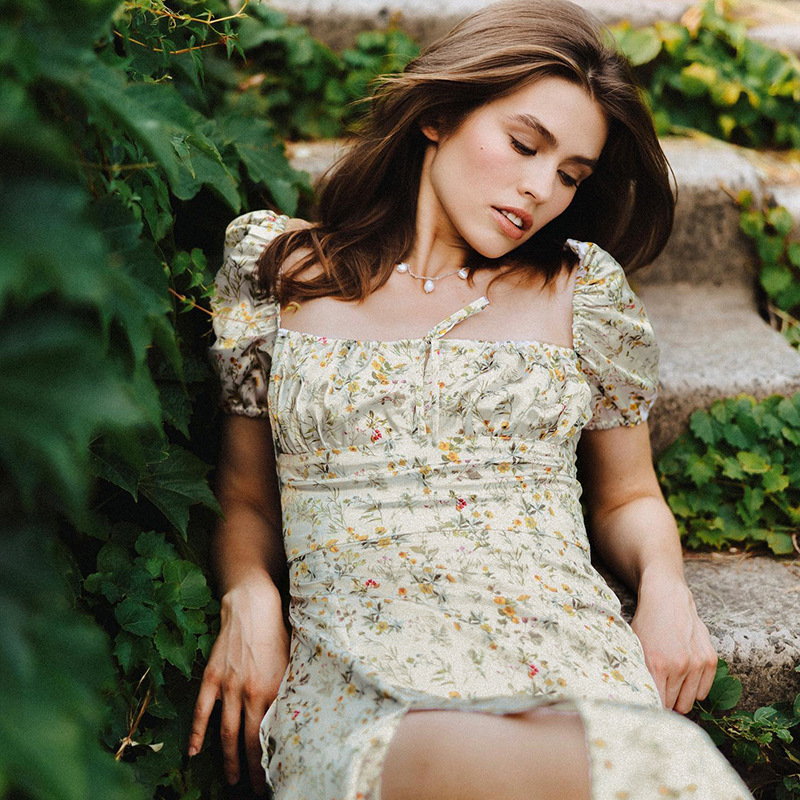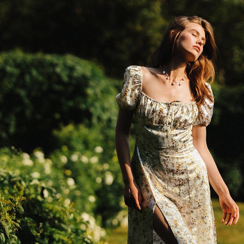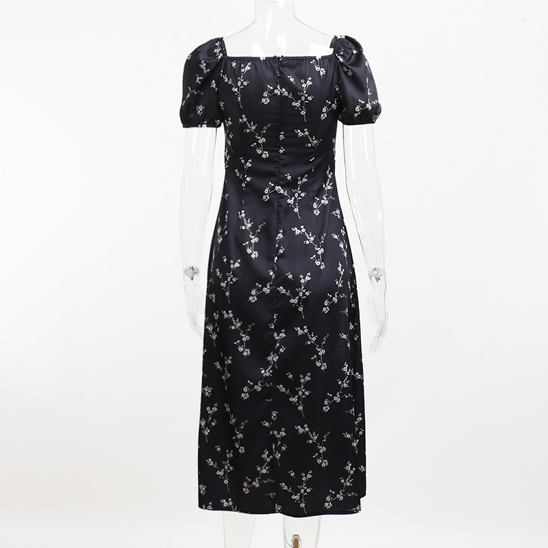 Printed Square Collar Knotted Split Dress Women Clothing 2022 Summer New Small Floral Dress