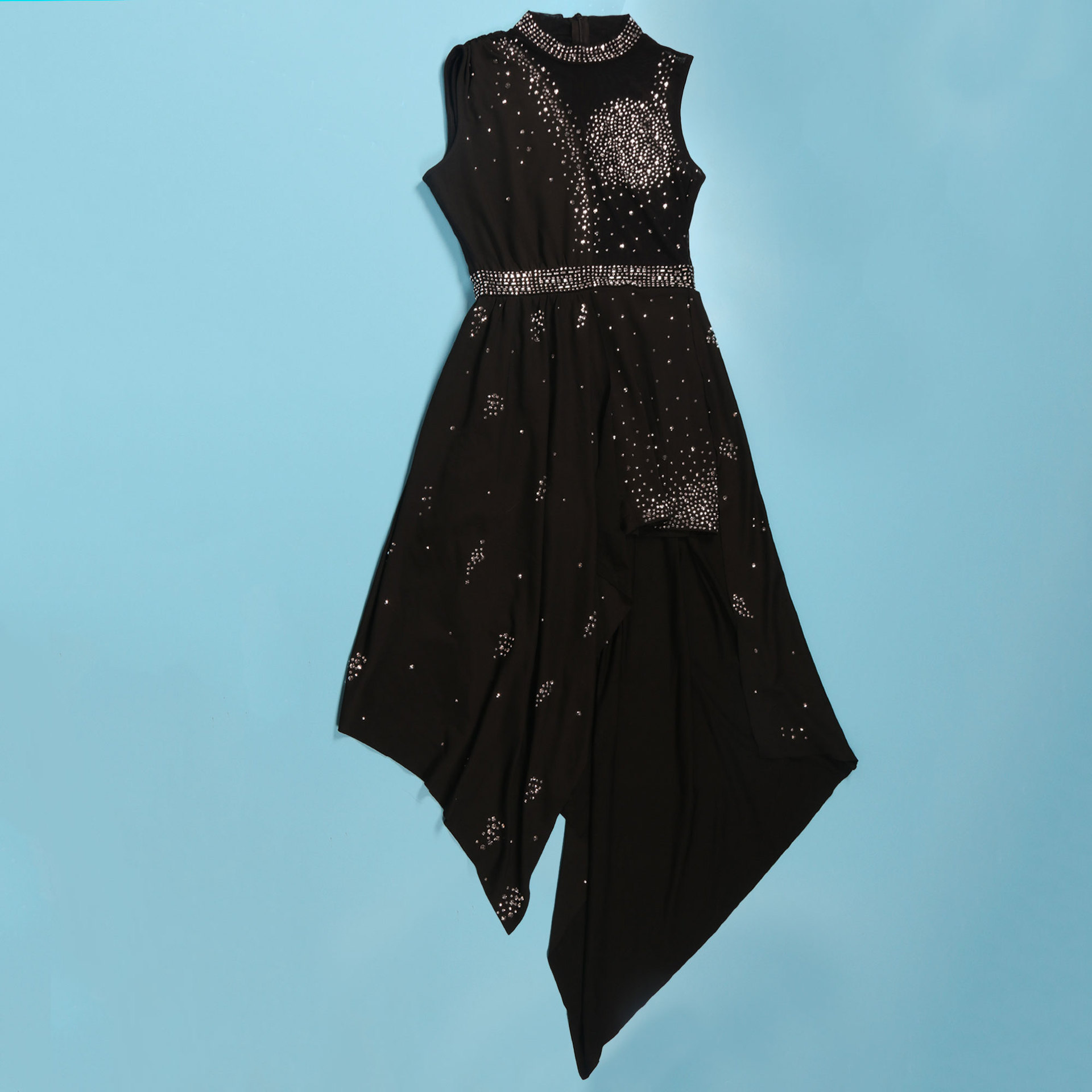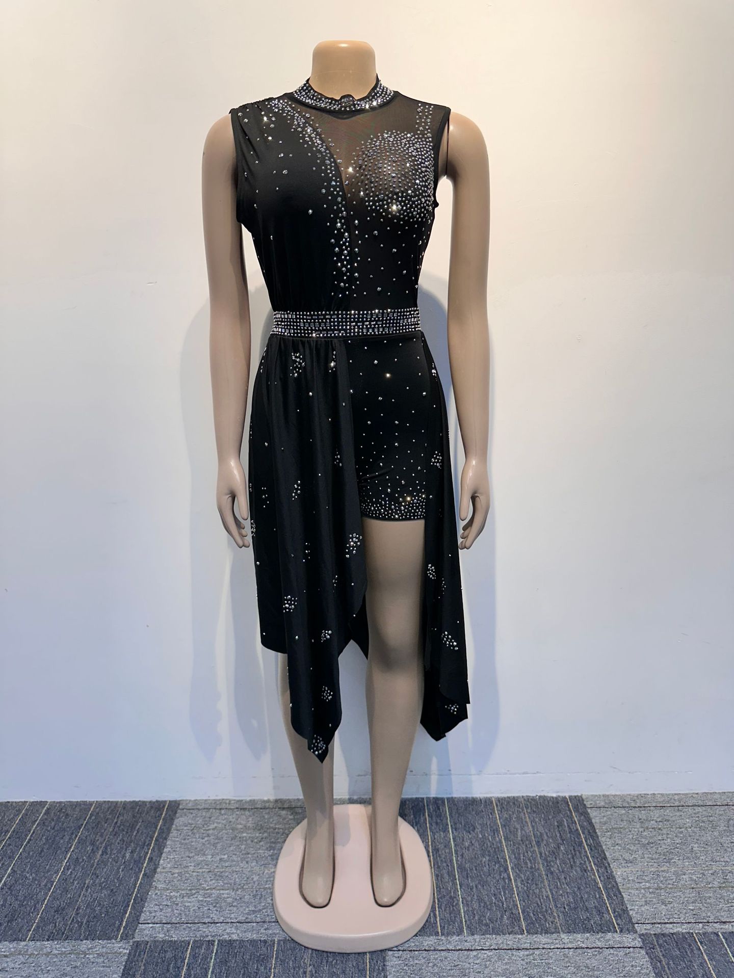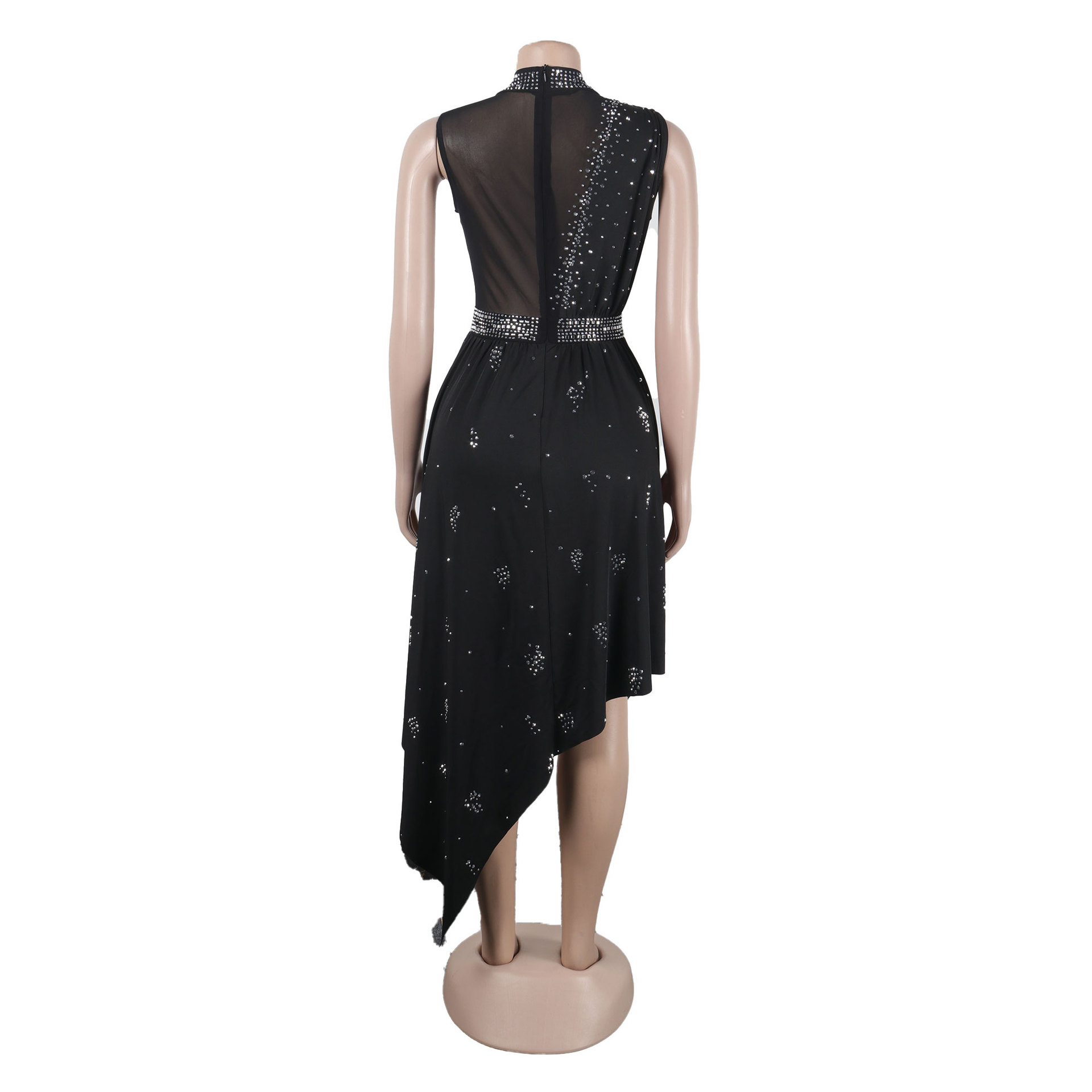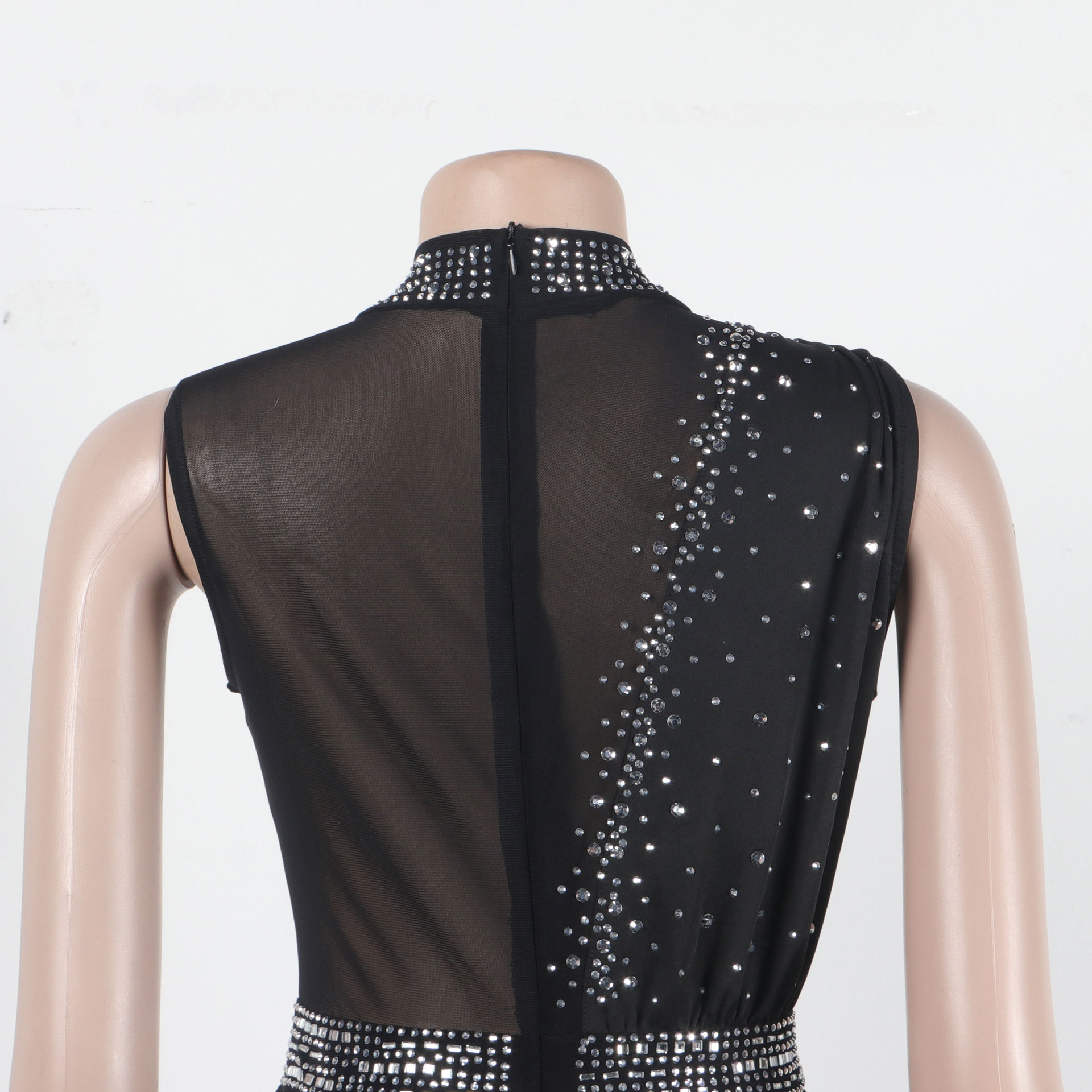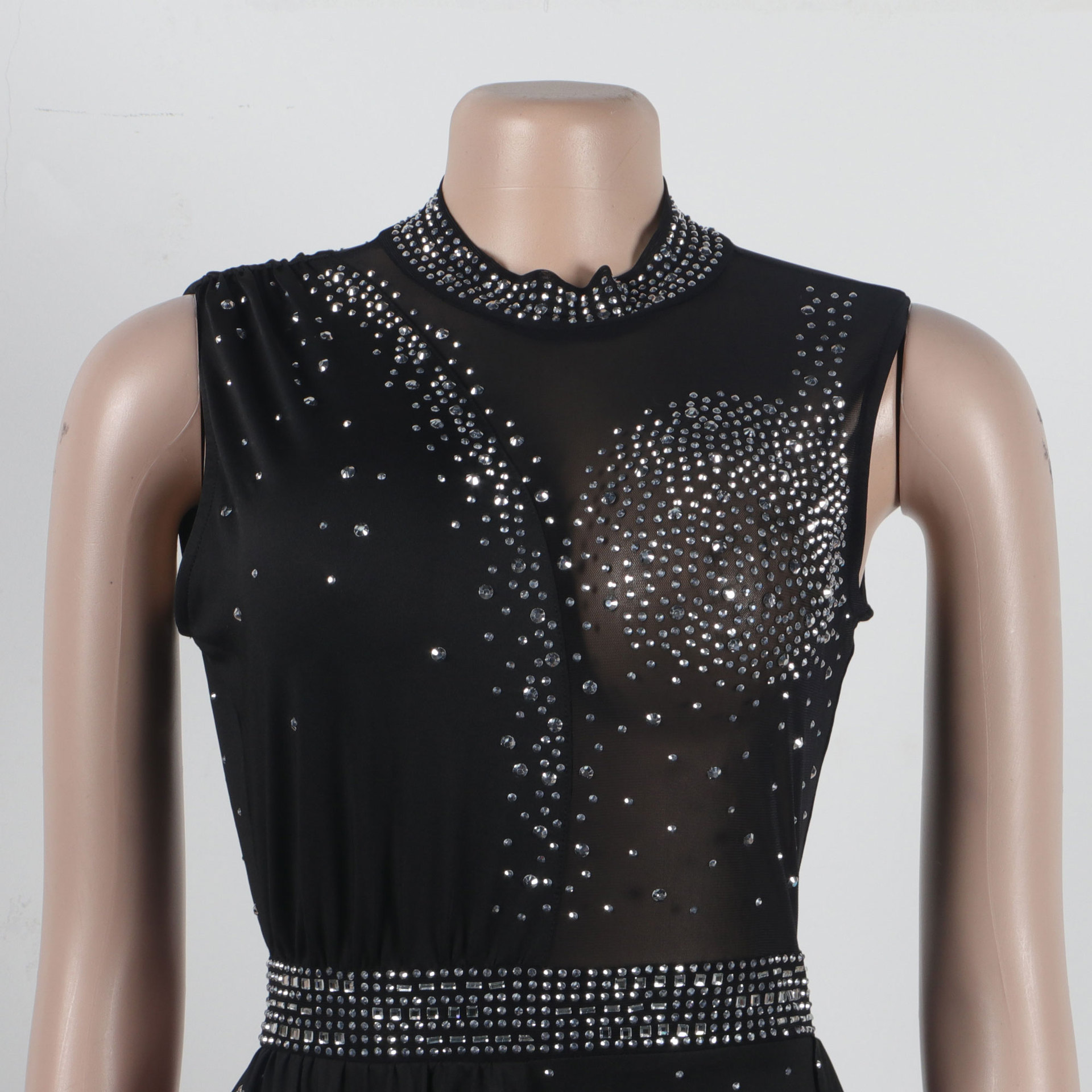 Sexy Slim Fit See through Sleeveless Irregular Asymmetric Hem Stitching Rhinestone Jumpsuit