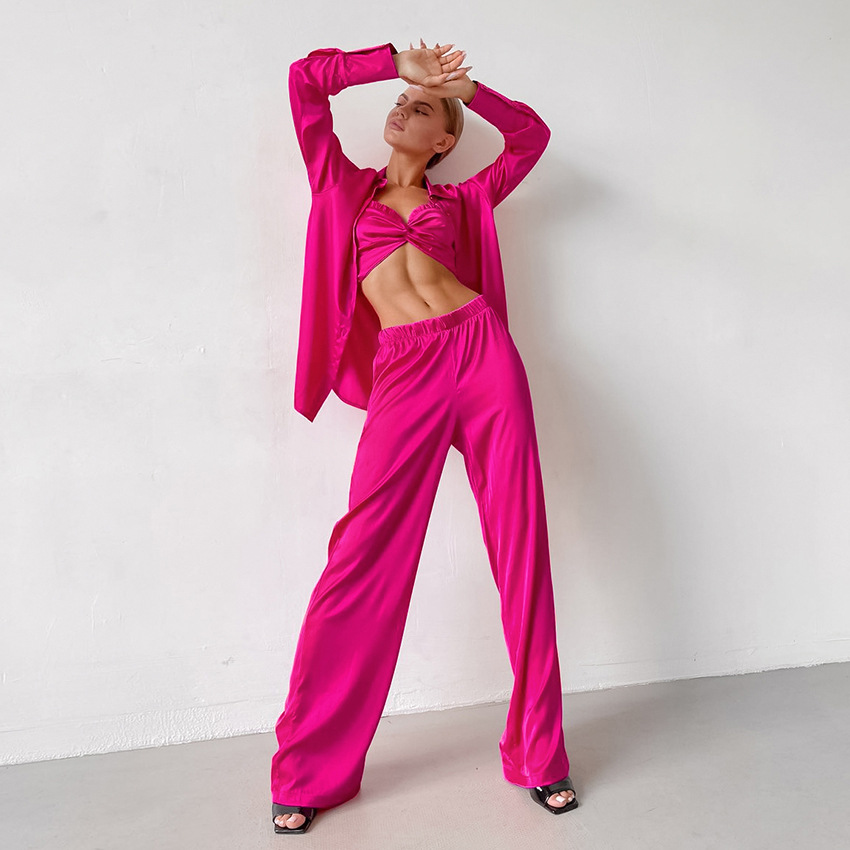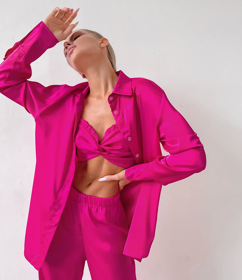 Strap Wooden Ear Sexy Underwear Long Sleeve Polo Collar Top Three-Piece Set Artificial Silk Home Fashion Women Pajamas
