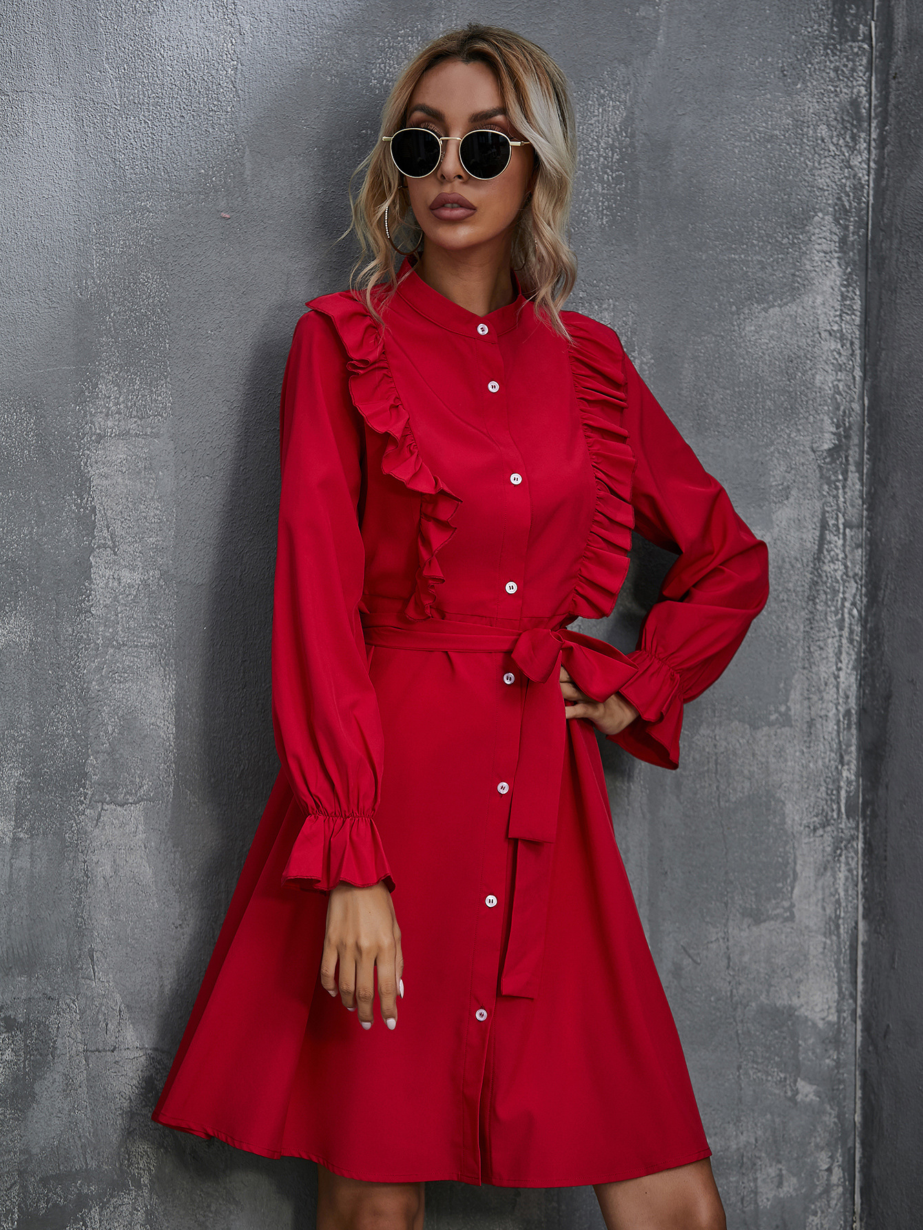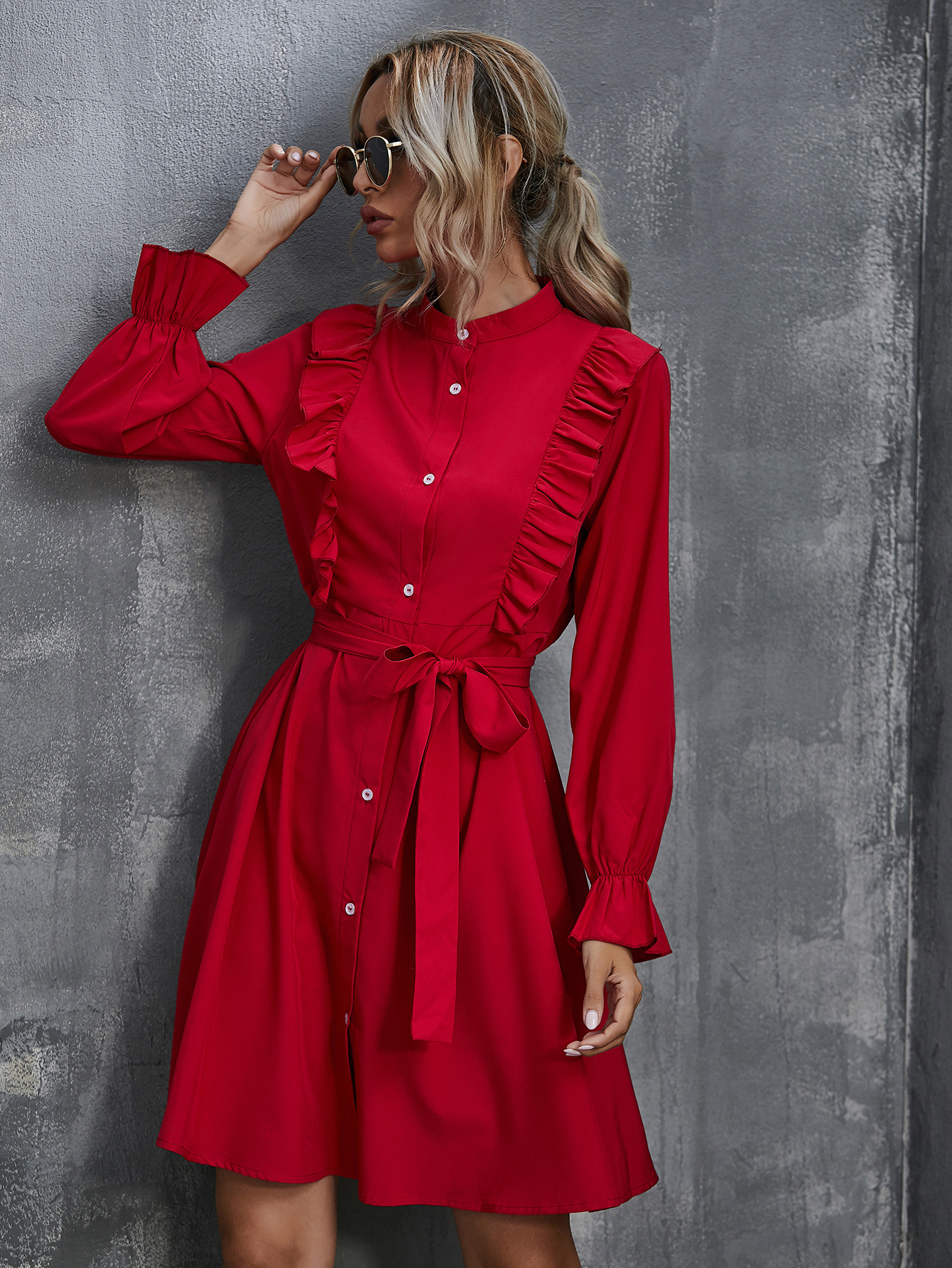Women Autumn Winter Red High Elegant Commuter Cardigan Ruffled Belt Dress