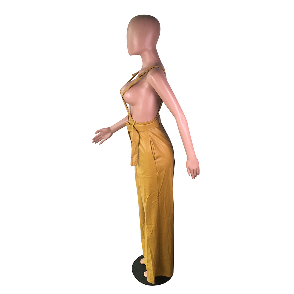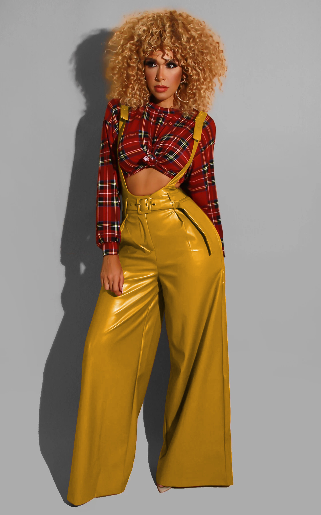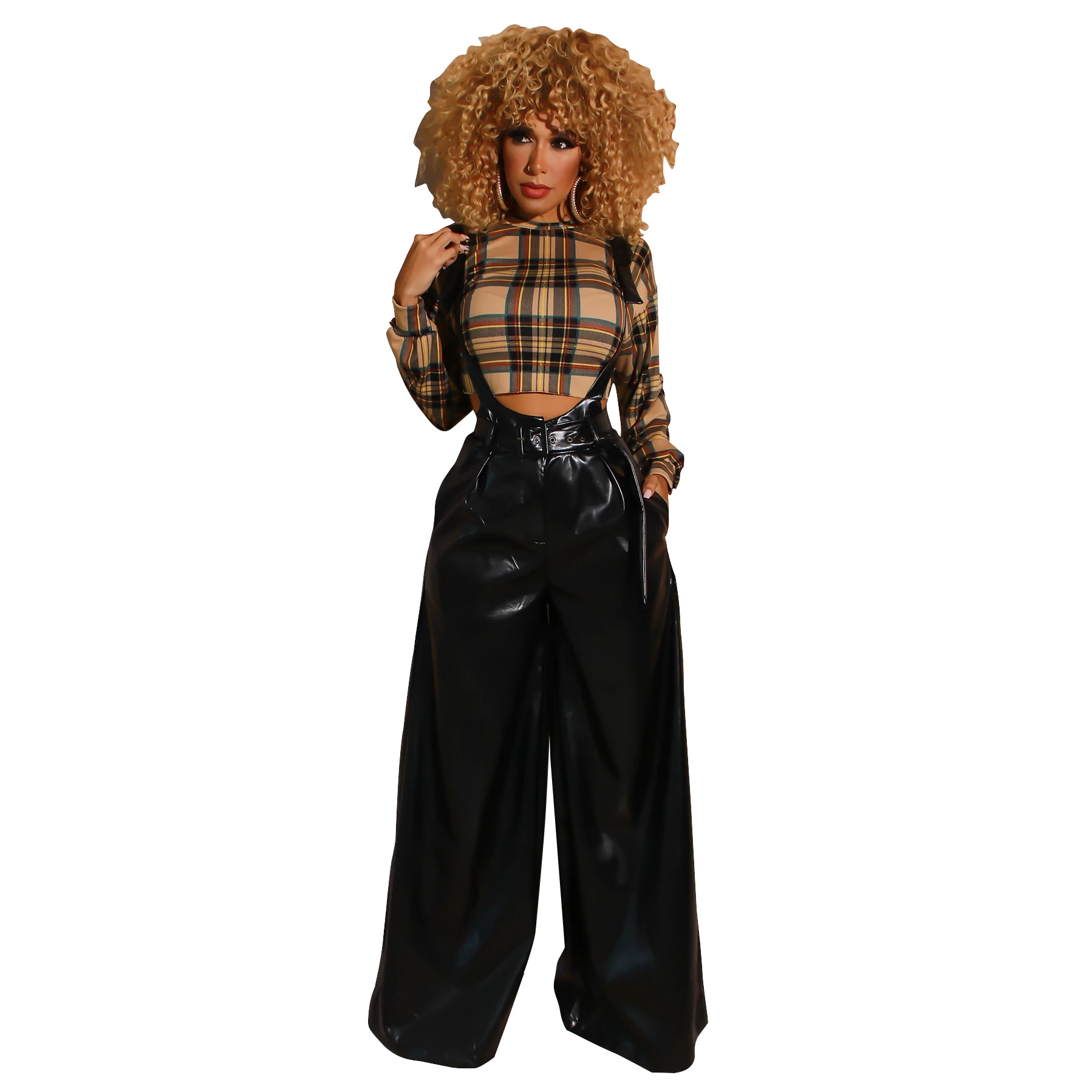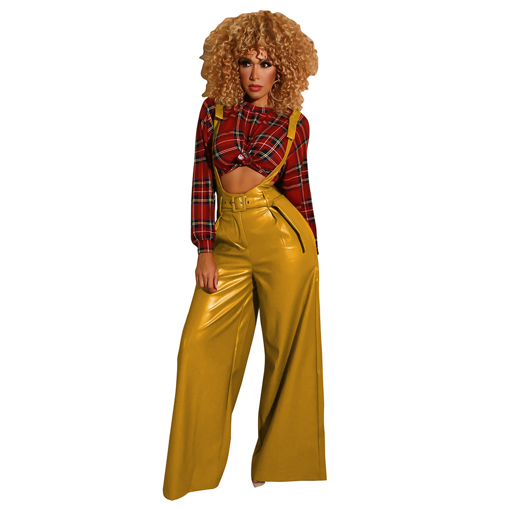 Women Clothing Fashion Casual Sexy with Belt PU Leather Suspenders Bell-Bottom Pants
