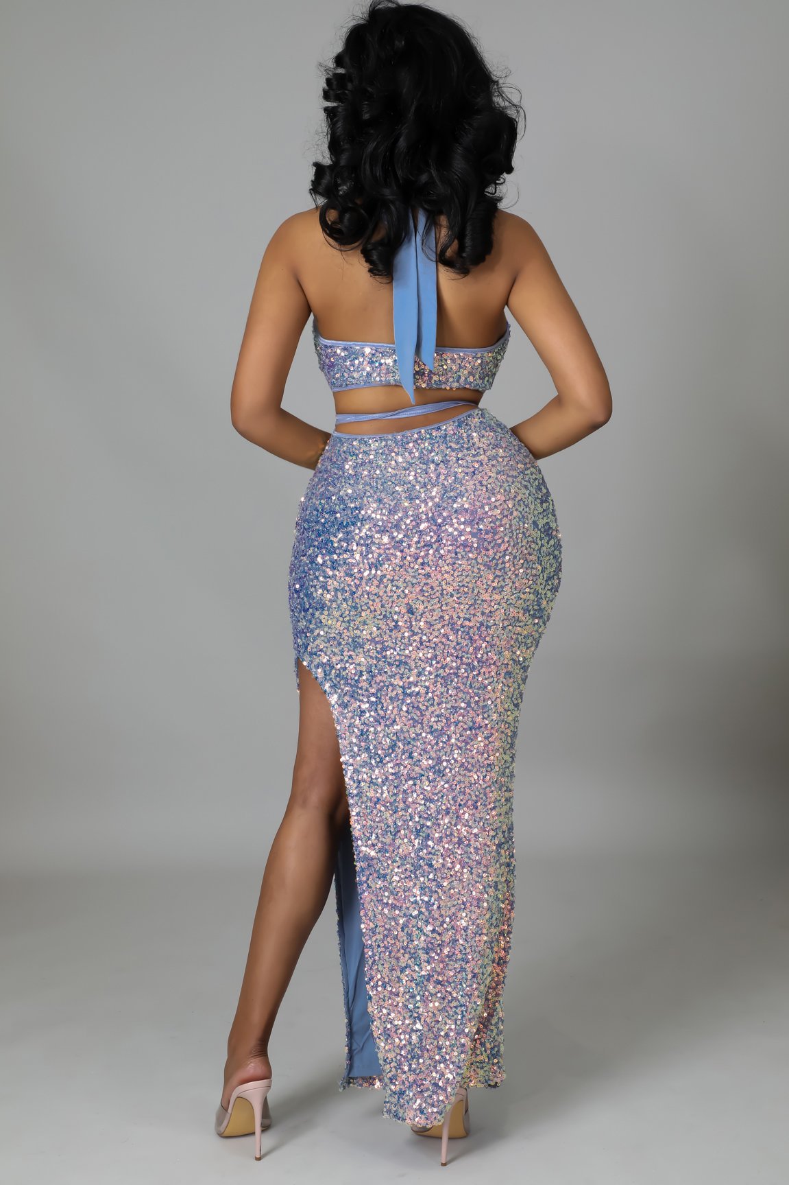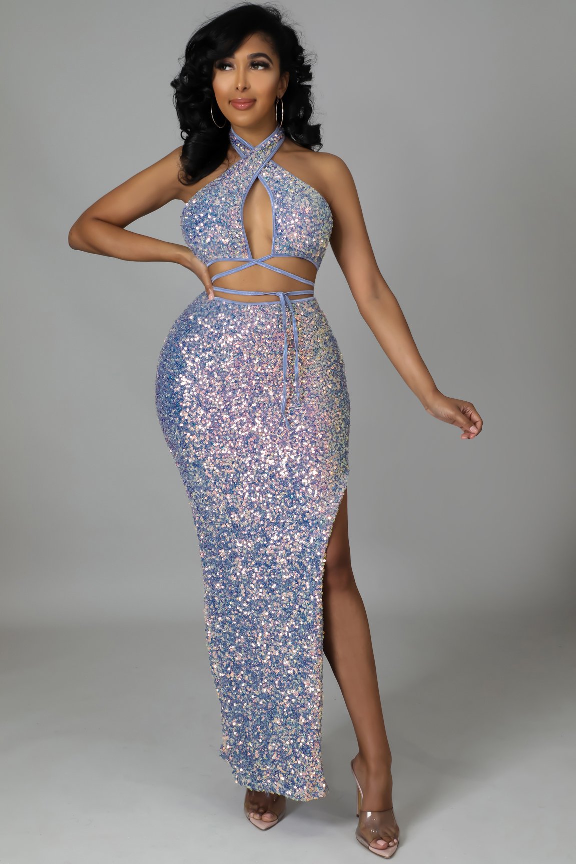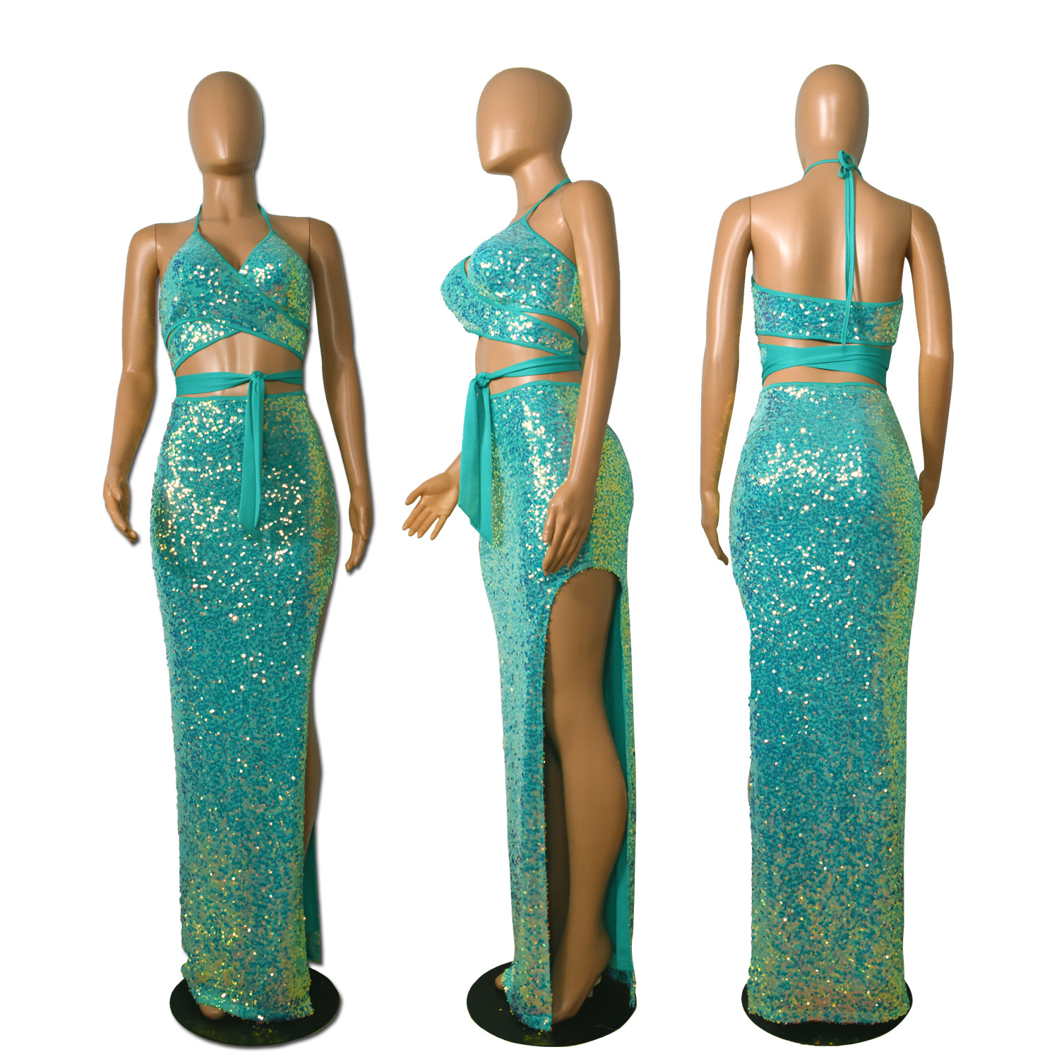 Women Clothing Two-Piece Halter Split Sequined Dress Sexy Sheath Party Dress
