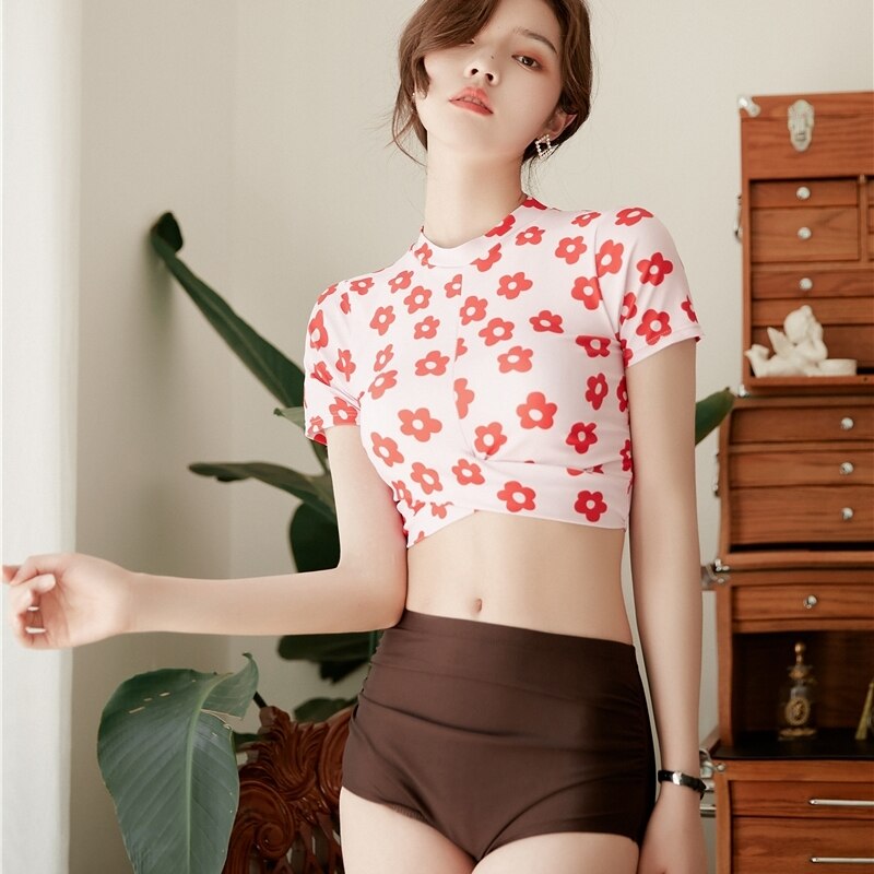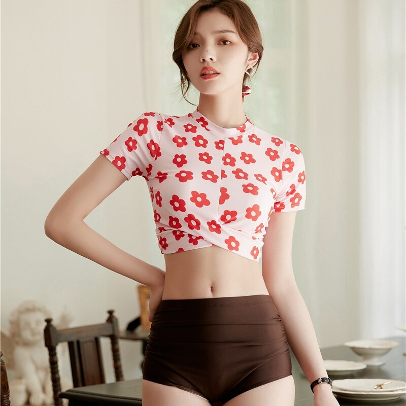 Flower Print Swimsuit Short Sleeve Bathsuit High Waist Bikini Set Push Up Swimwear Women's Two Piece Biquinis Pad Bodysuit