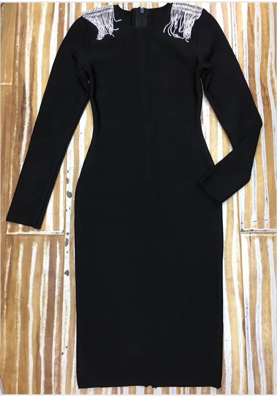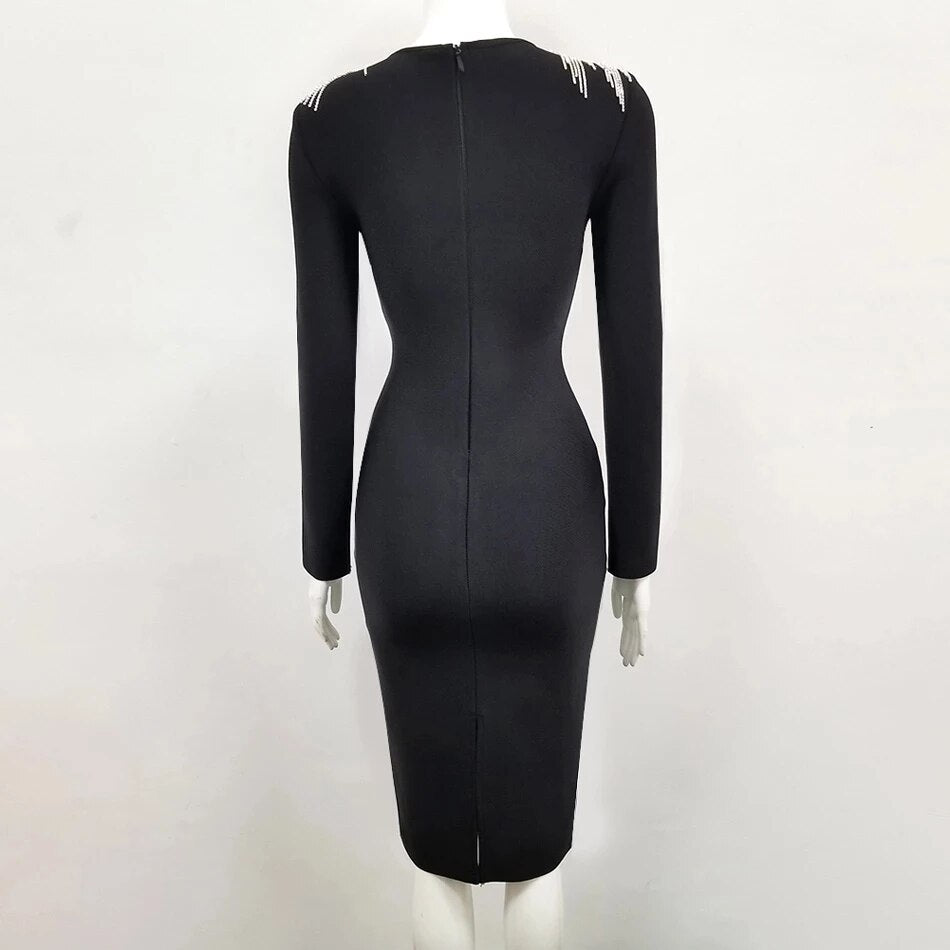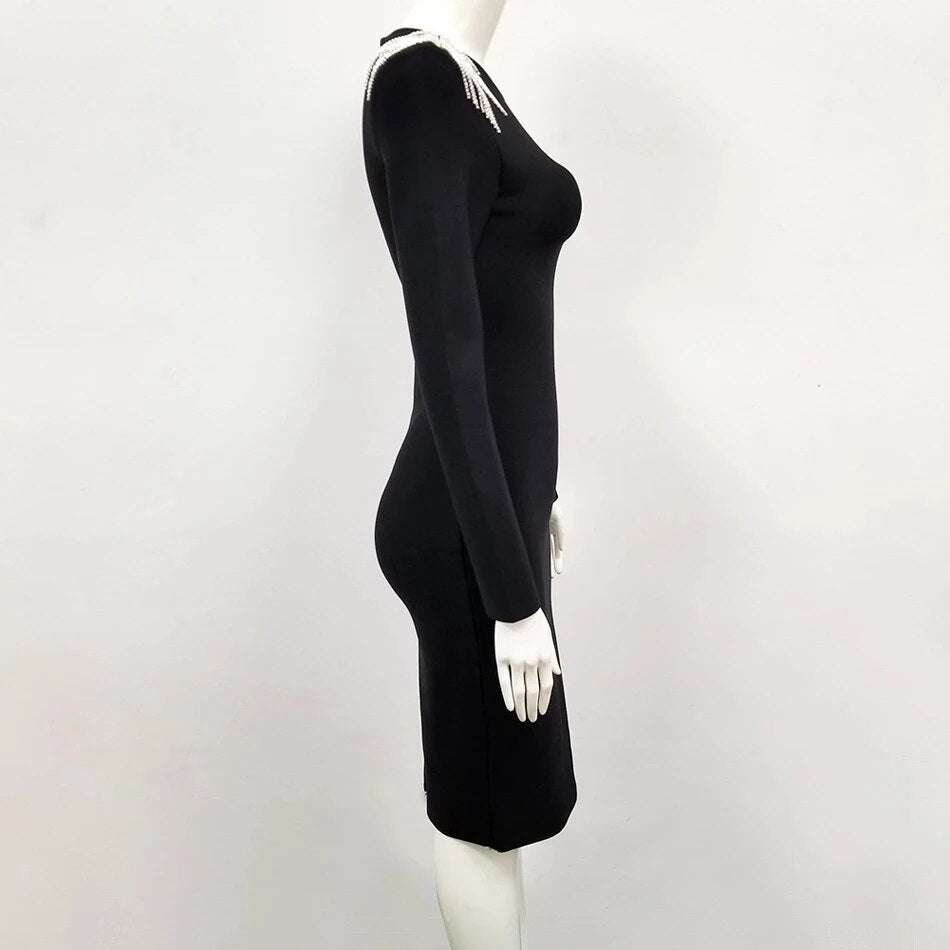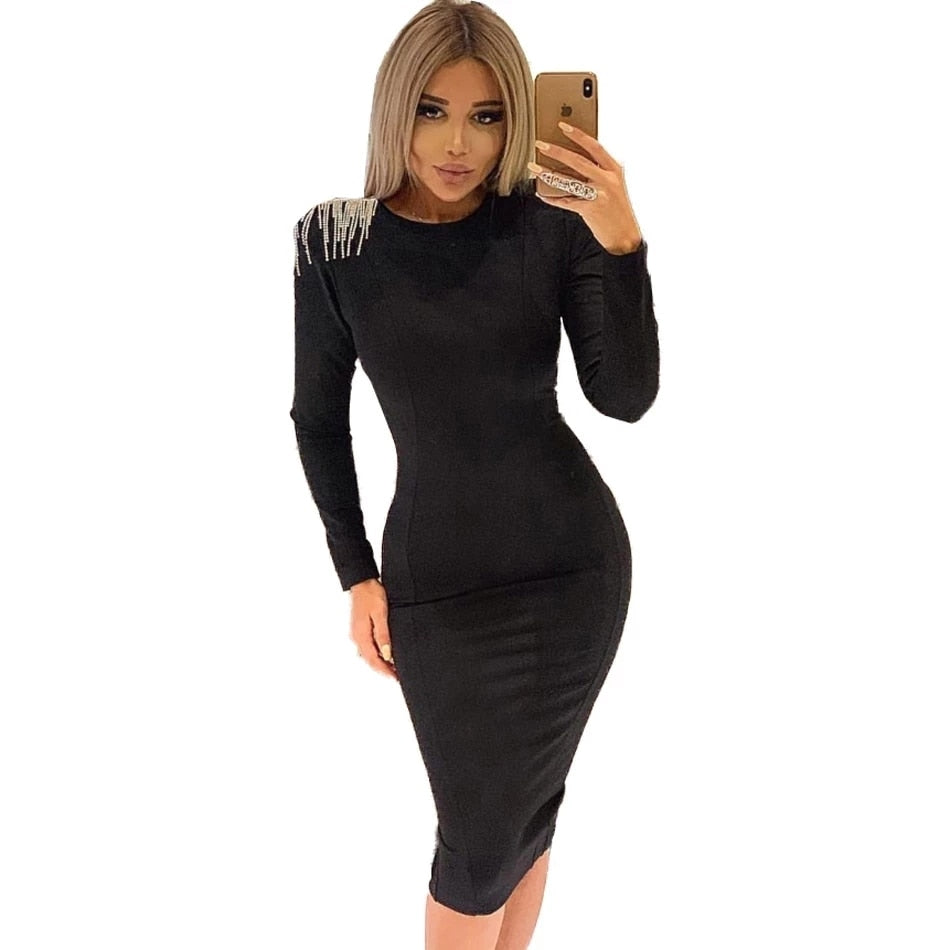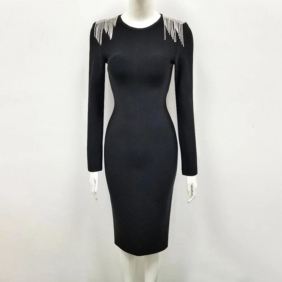 Free Shipping 2020 New Women Bandage Dress Black Sexy O-neck Long Sleeve Chain Fringe Dress Bodycon Elegant Club Party Vestidos