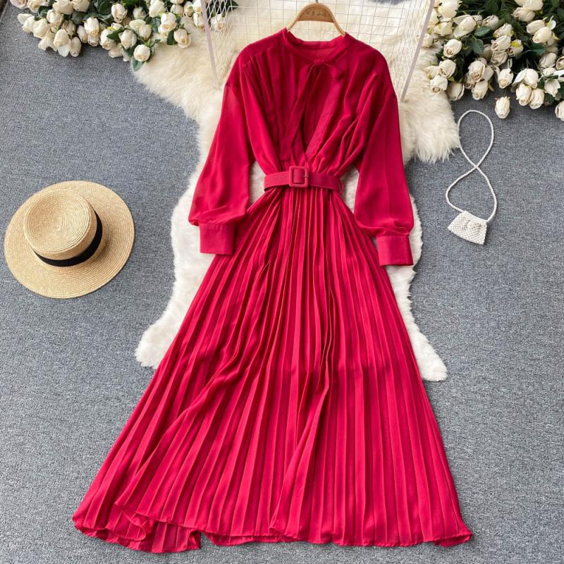 Korean Chic Fashion Pleated Chiffon Dress V-neck Lace-up Waist-Controlled Slimming Elegant Graceful Swing Maxi Dress Maxi