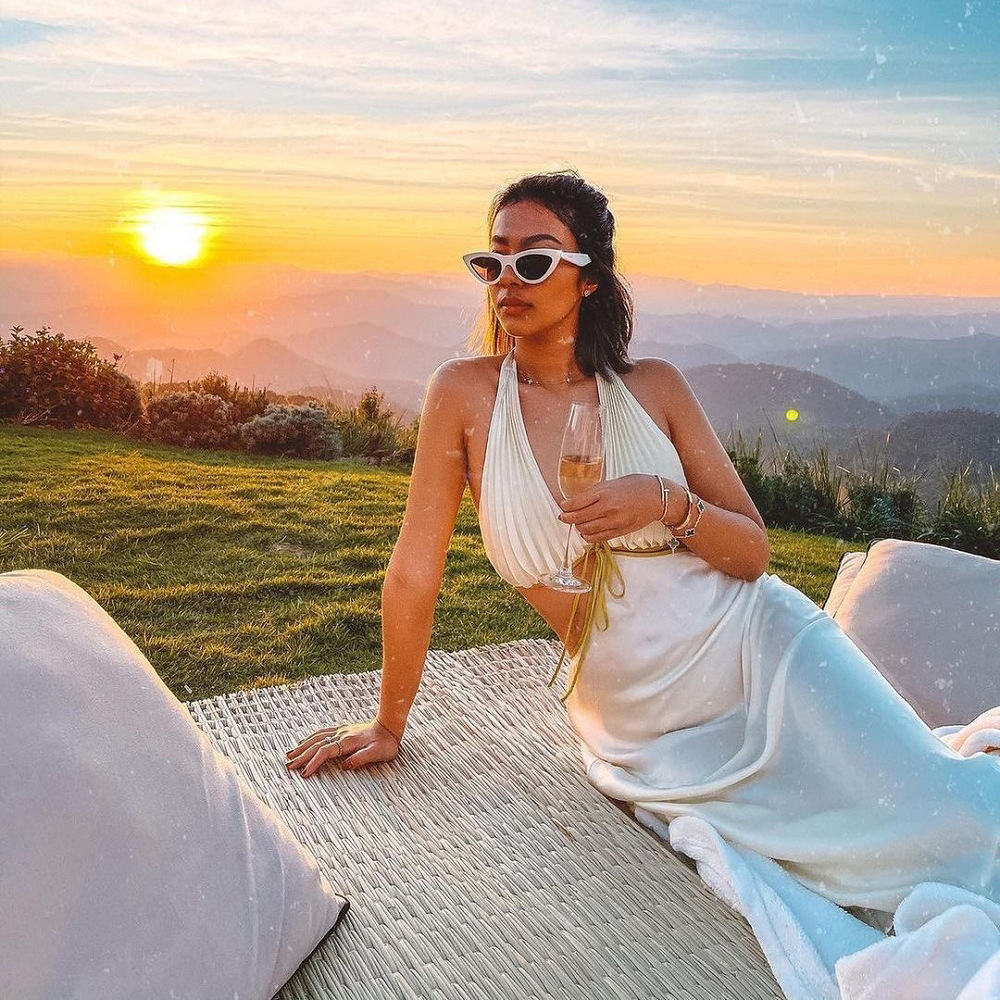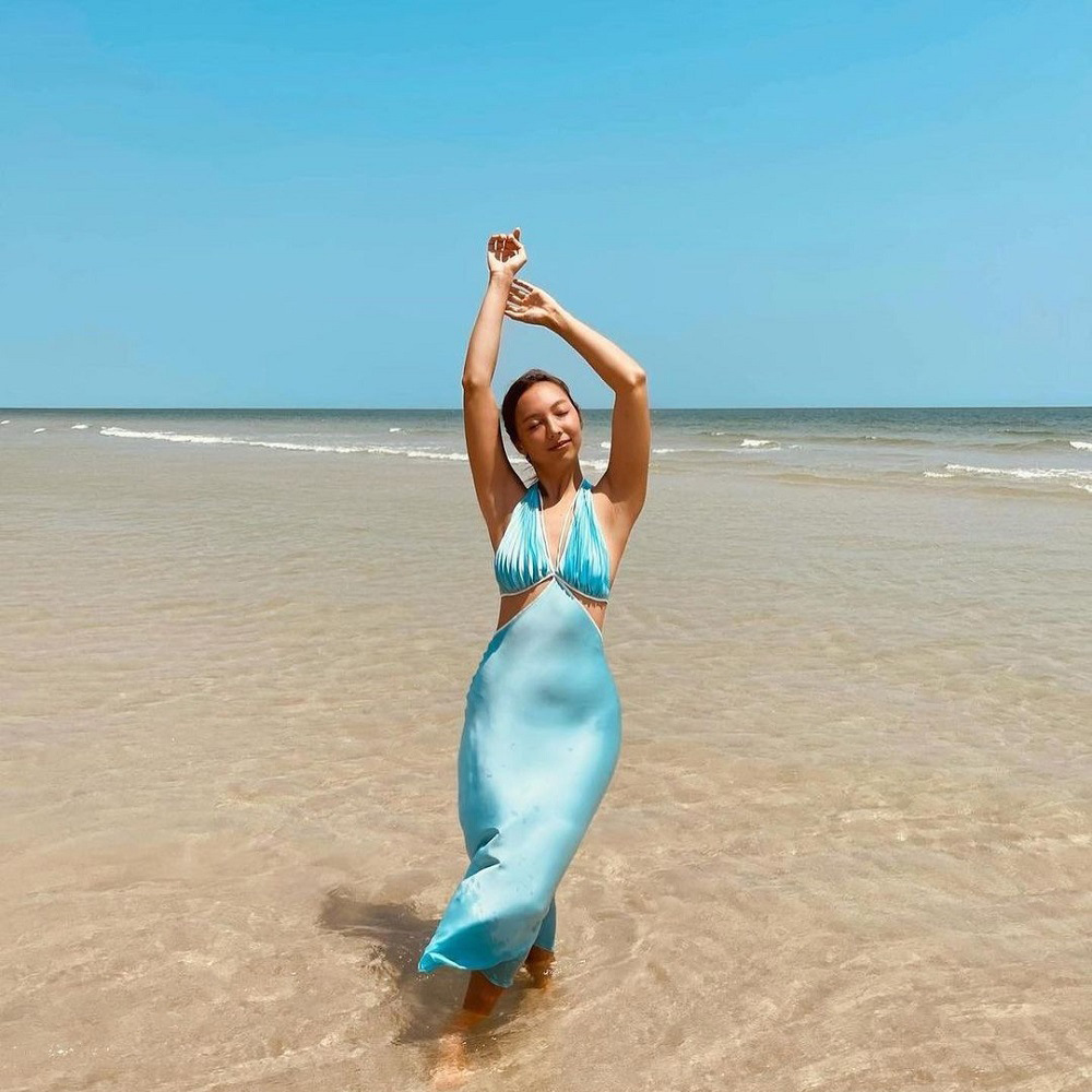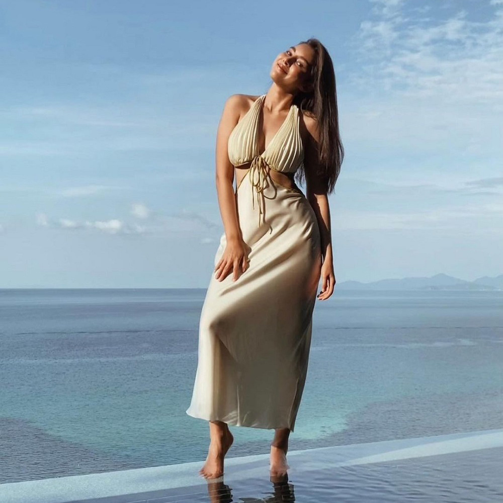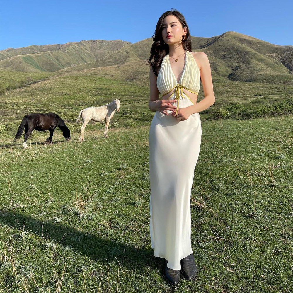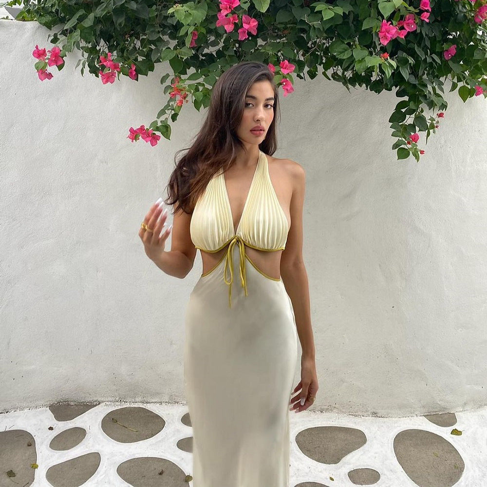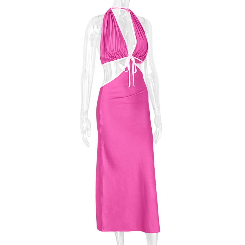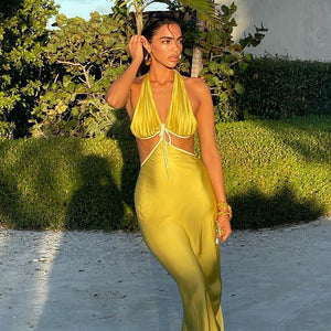 New Deep V High Elastic Satin Sexy Cutout Green Dress Summer Halter Temperament Midi Skirt
