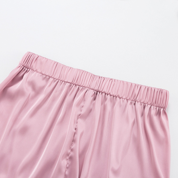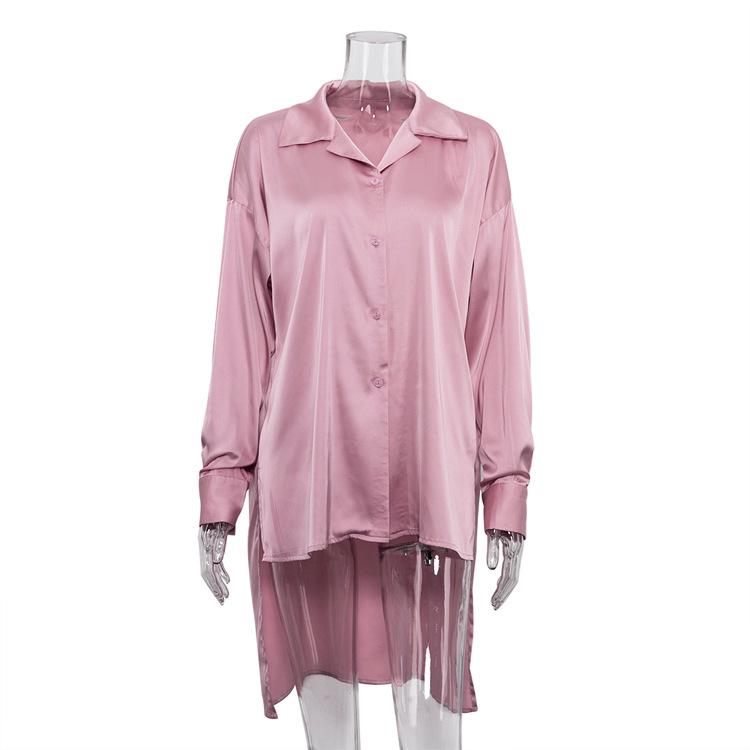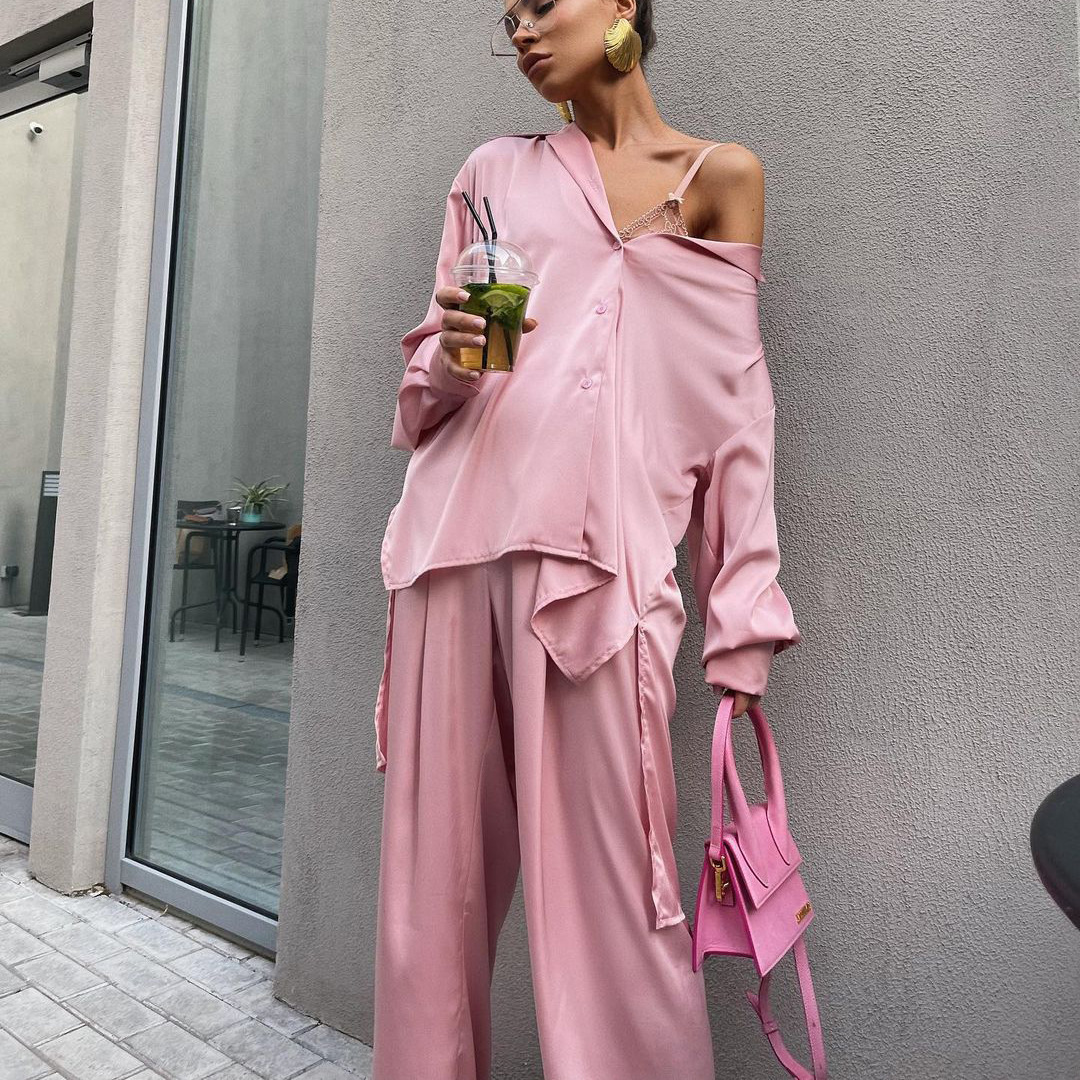 Pink Satin High-Waisted Trousers Elegant Long Sleeve Top Two-Piece Shirt Casual Wide Leg Pants Suit