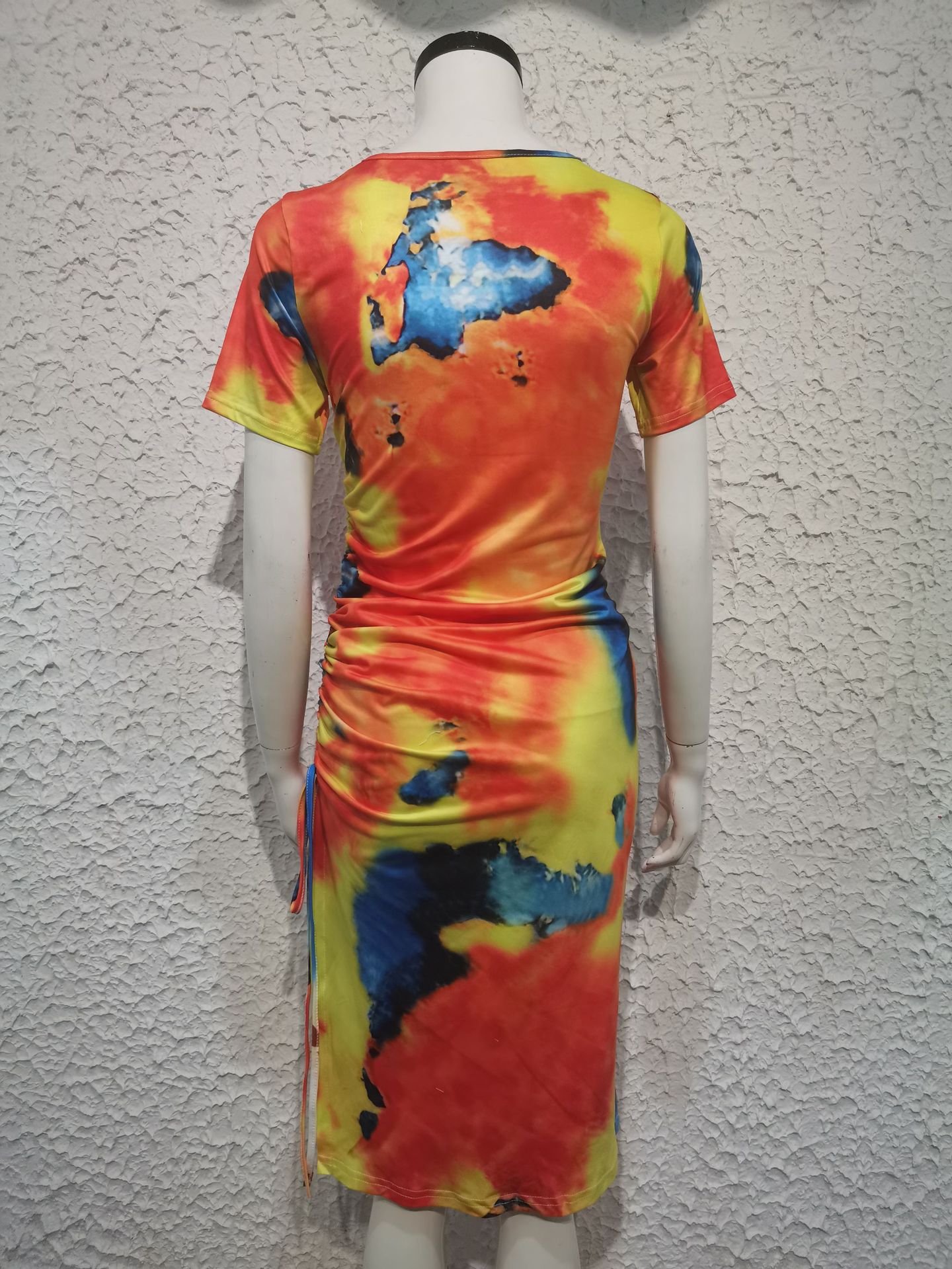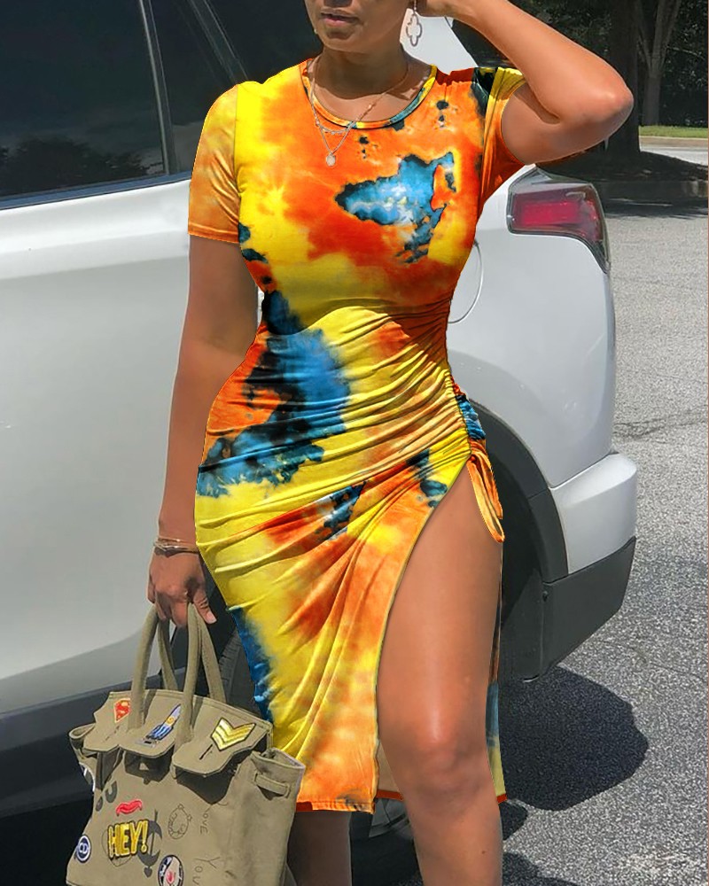 Spring Summer New Tie Dyed Printed Sheath Split Lace-up Elegant Sexy Dress for Women
