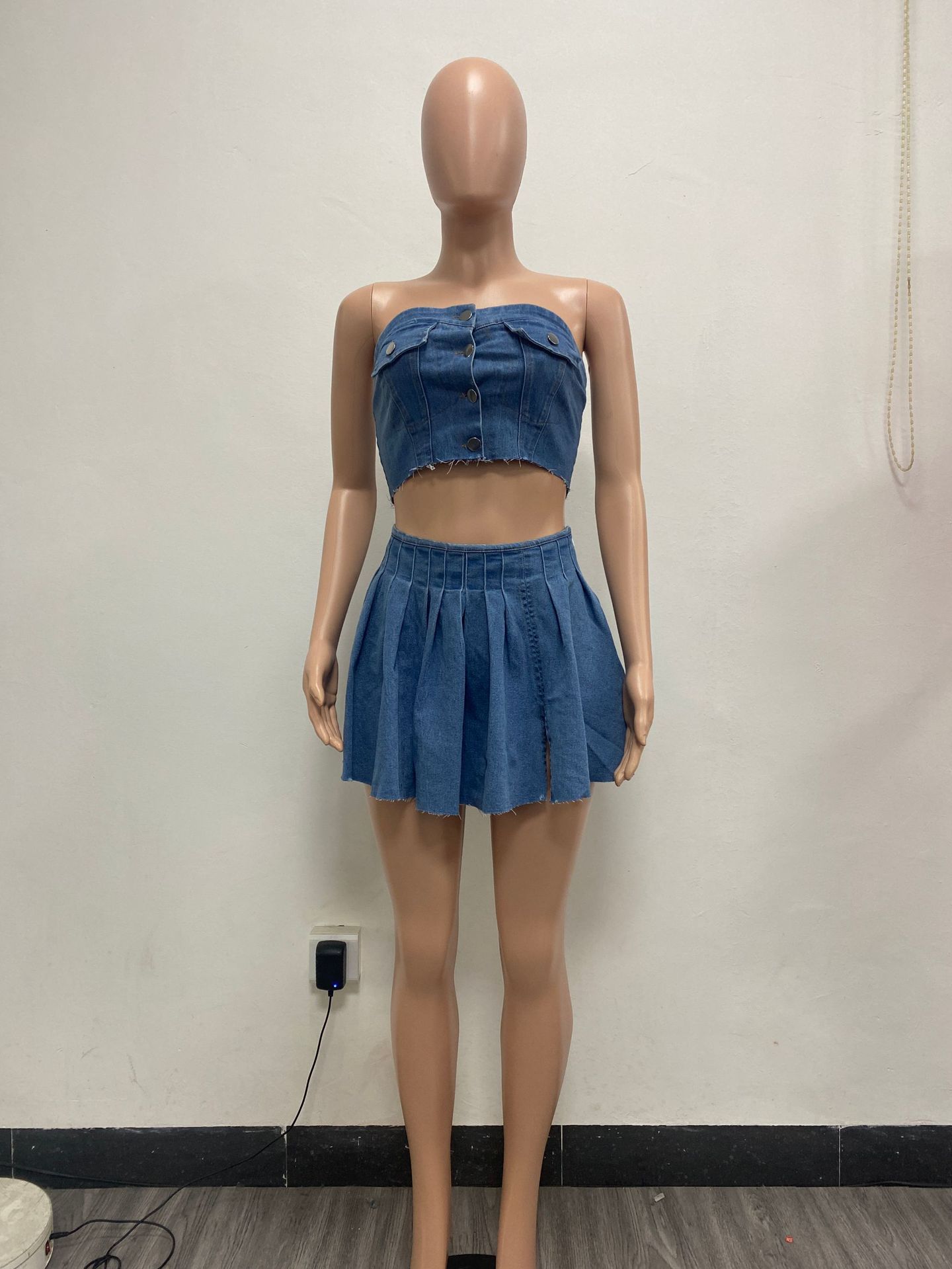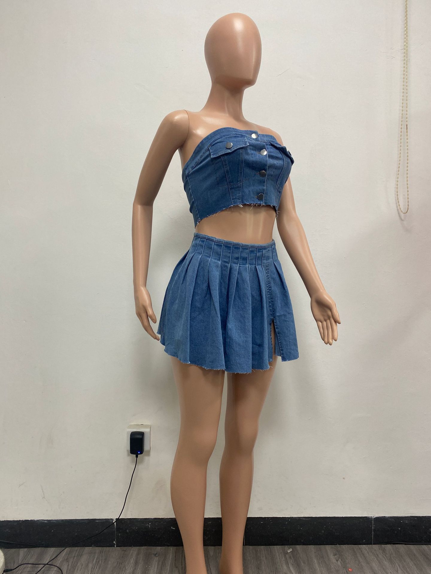Street Trend Elastic Wrapped Chest Button Denim Split Skirt Set
