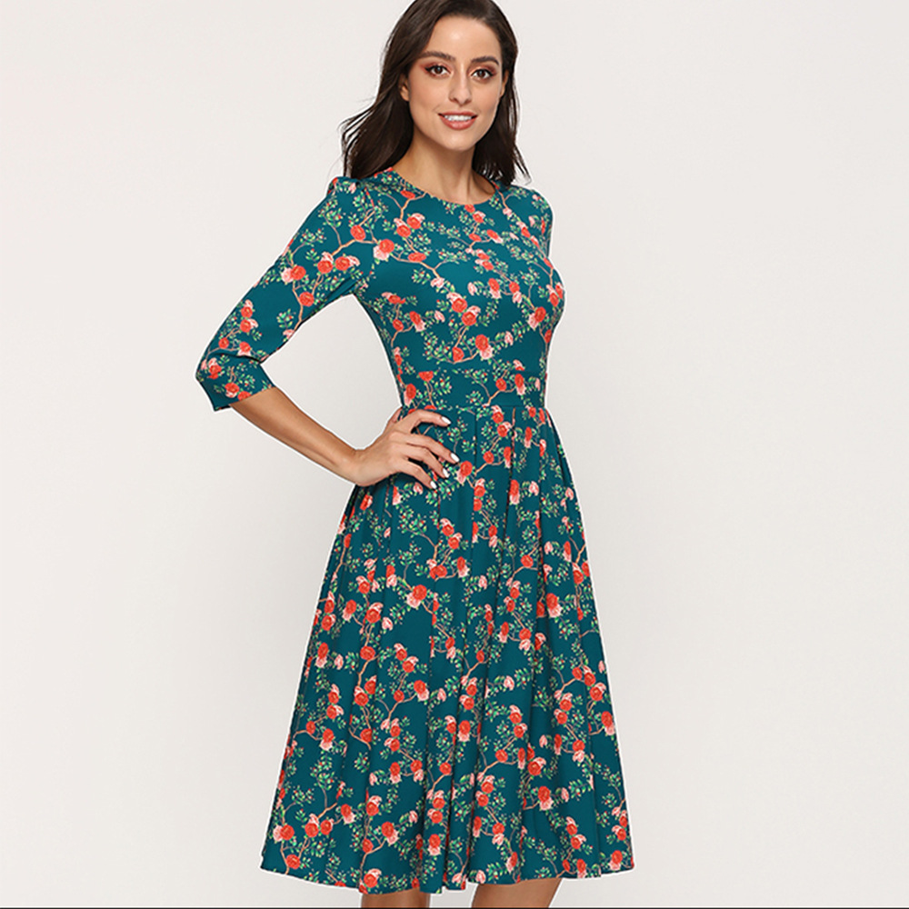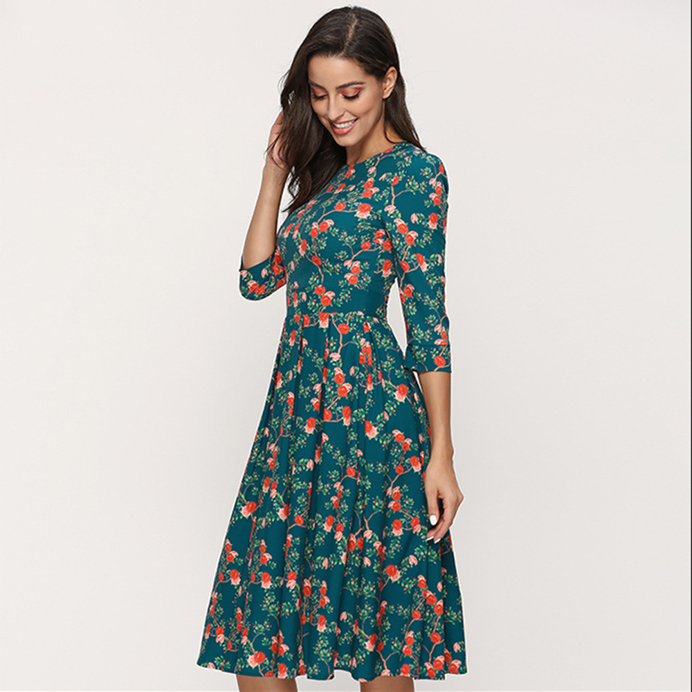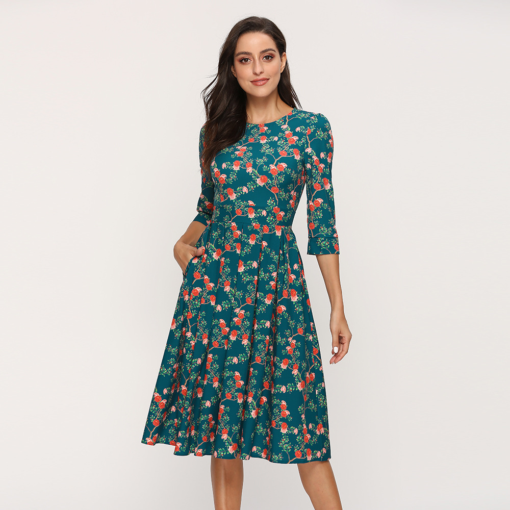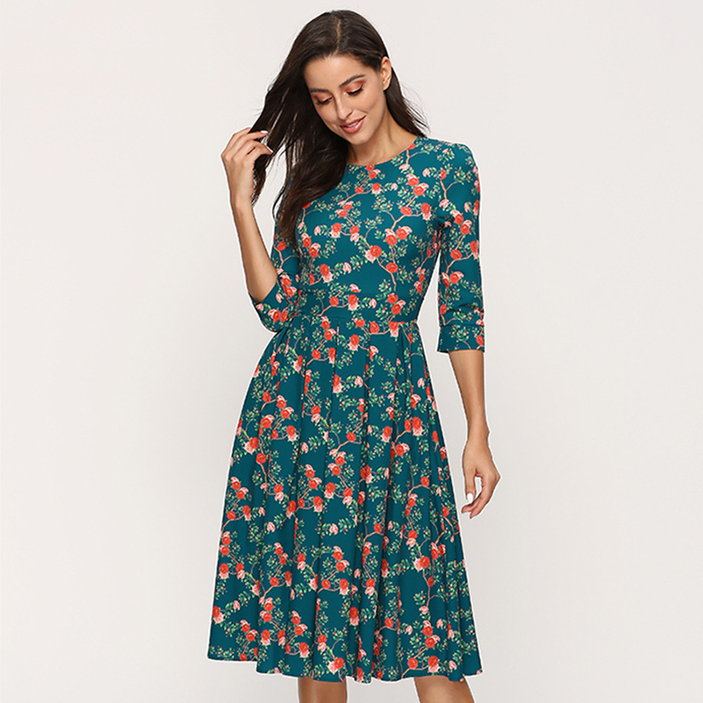 Summer Autumn Floral Casual Dress round Neck 3/4 Sleeves Slim-Fit Party Dress