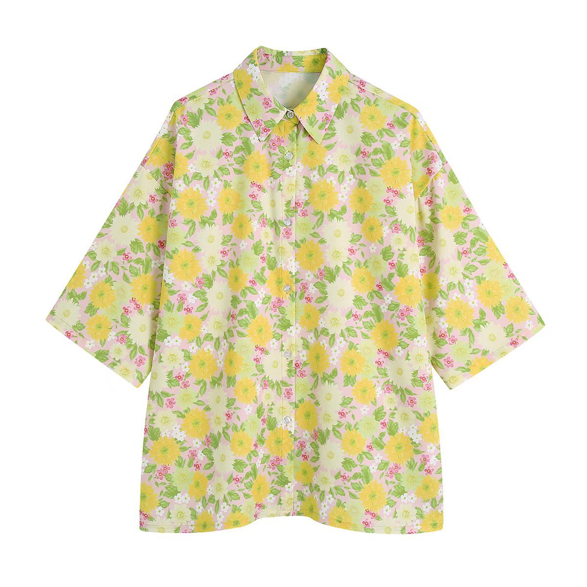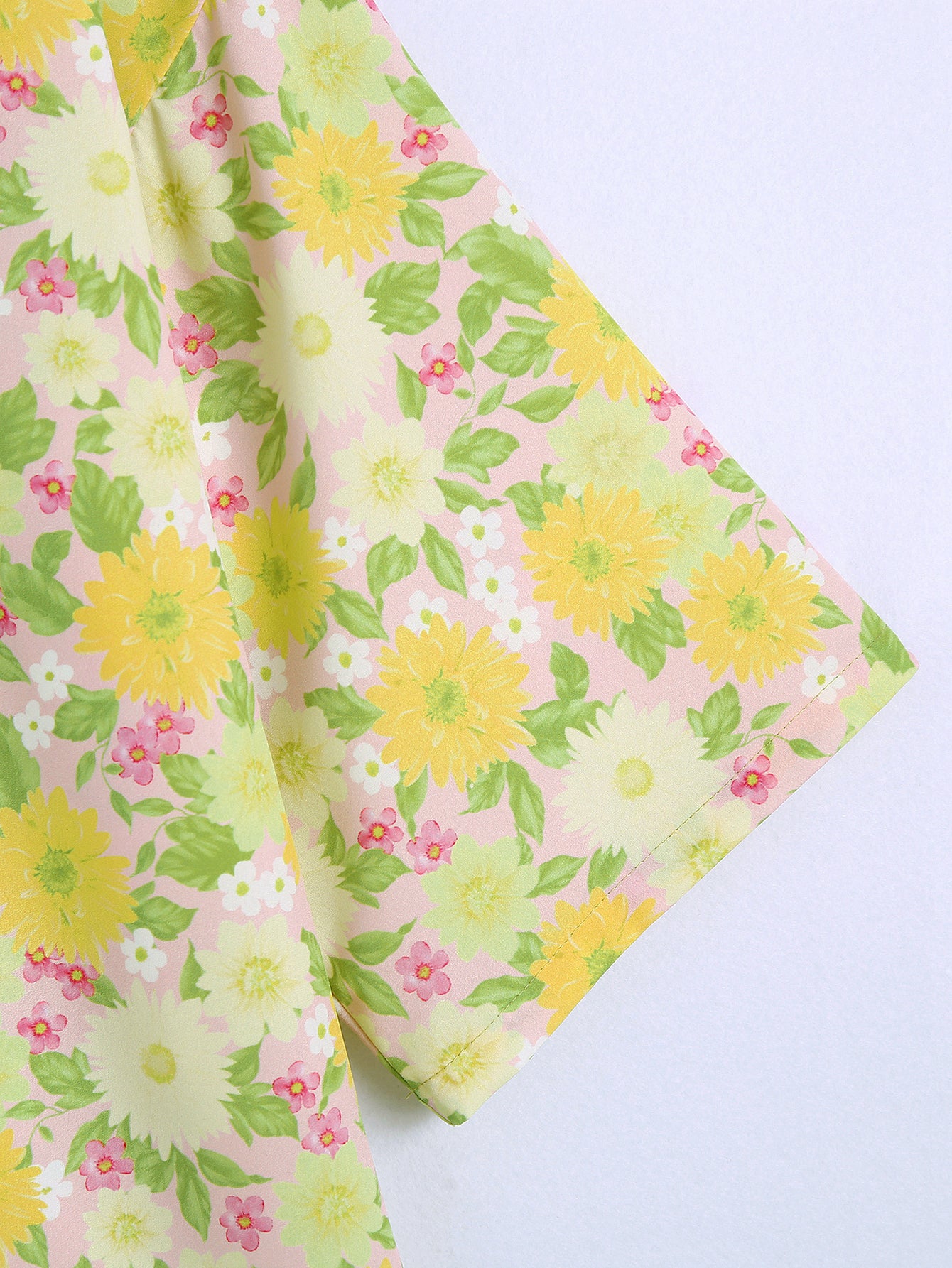 Summer New Fashion Retro Lapels Short Sleeve Single Breasted Yellow Printings Dress Female