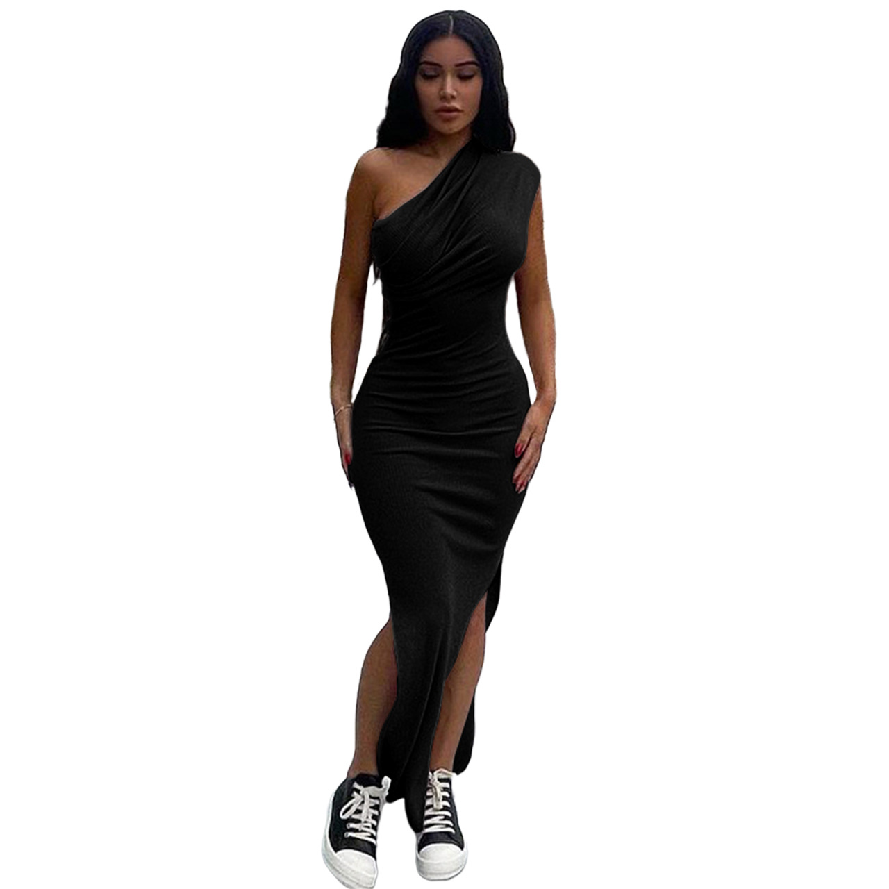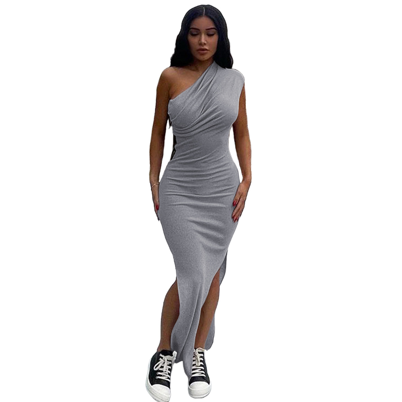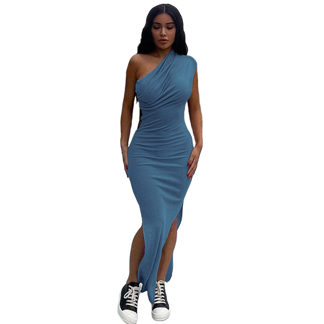 Women Clothing New Spring Summer Solid Color Thread Pleated Slant Shoulder Slit Maxi Dress