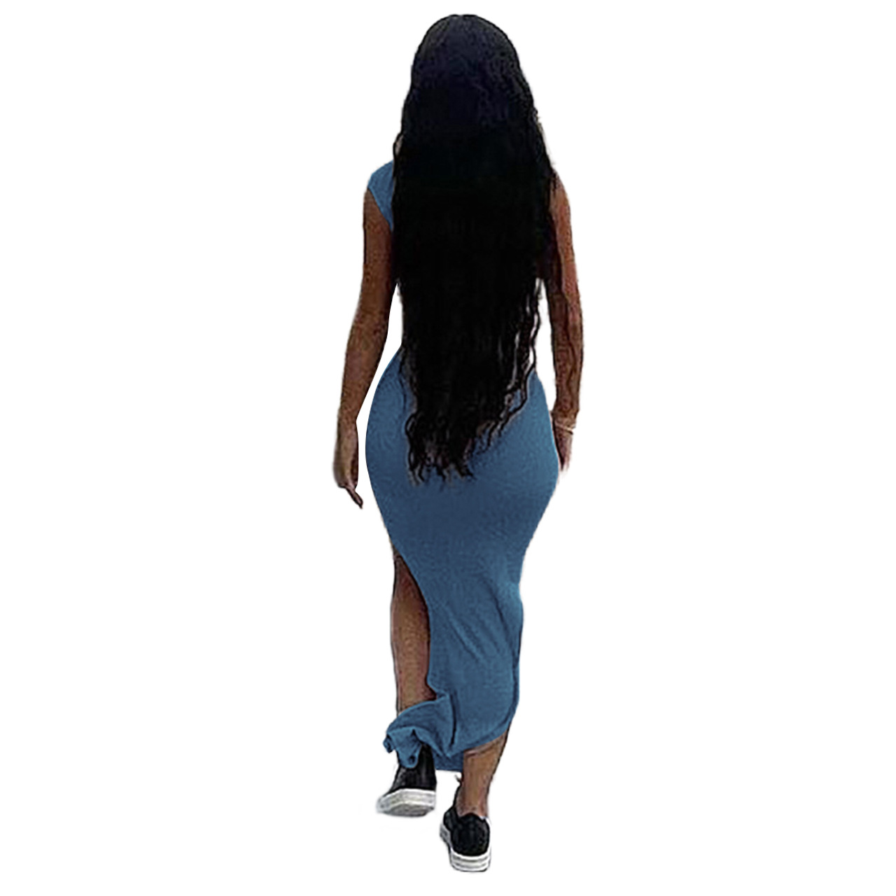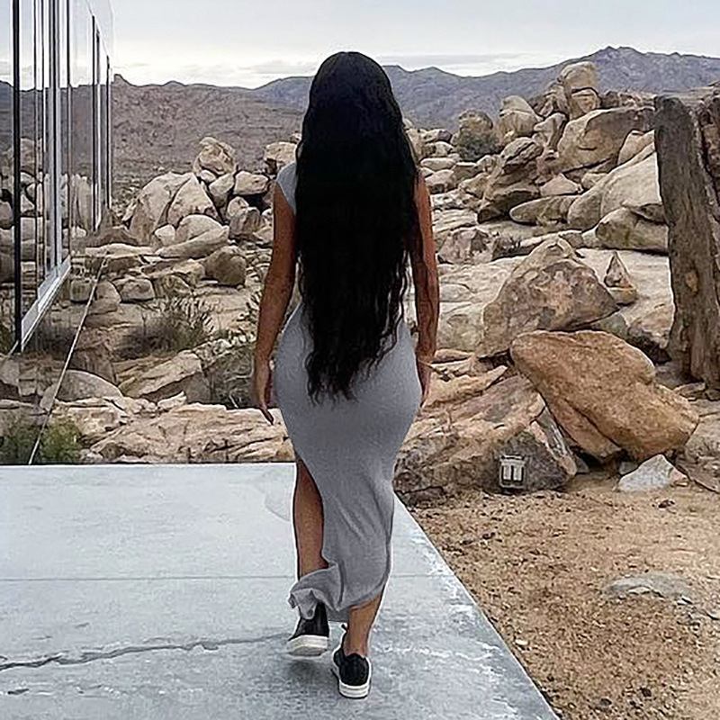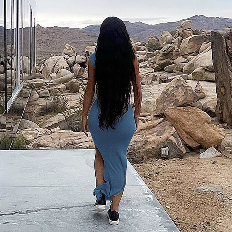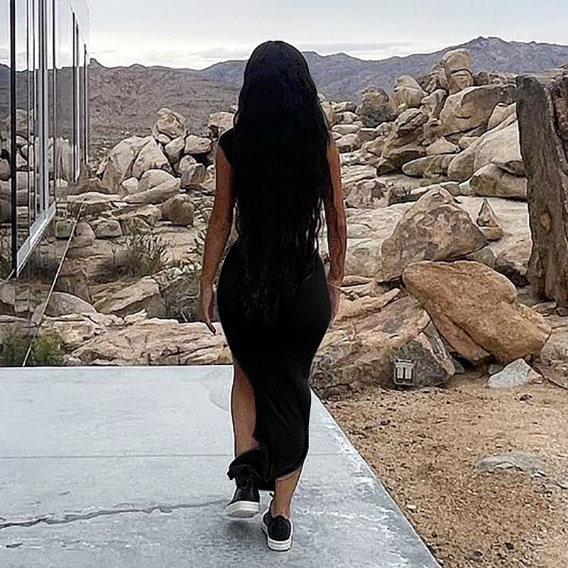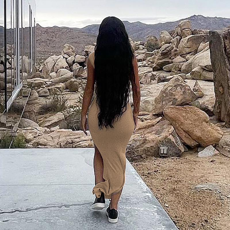 Women Clothing New Spring Summer Solid Color Thread Pleated Slant Shoulder Slit Maxi Dress