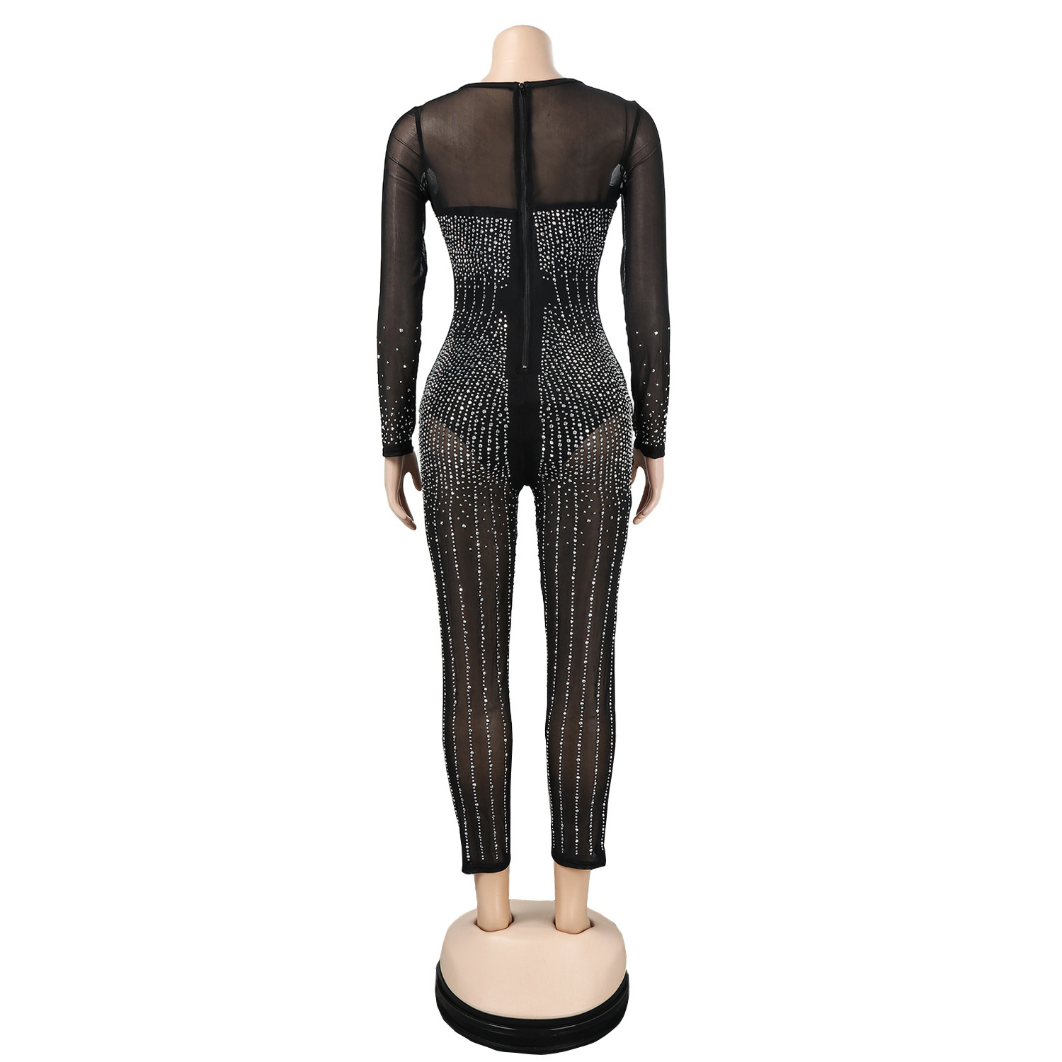 Women Clothing Sexy Mesh Rhinestone See-through Jumpsuit Long Sleeve Nightclub Uniforms Women