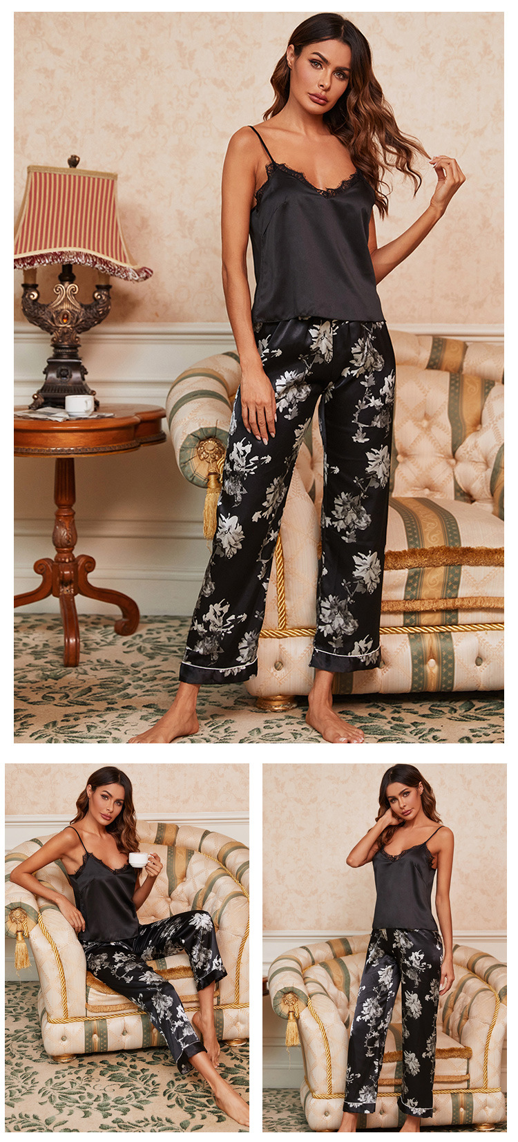 Women Silk like Wide Leg Pajamas Casual Homewear Spring Autumn Black White Printed Pajama Pants Suspenders Vest Two Piece Set